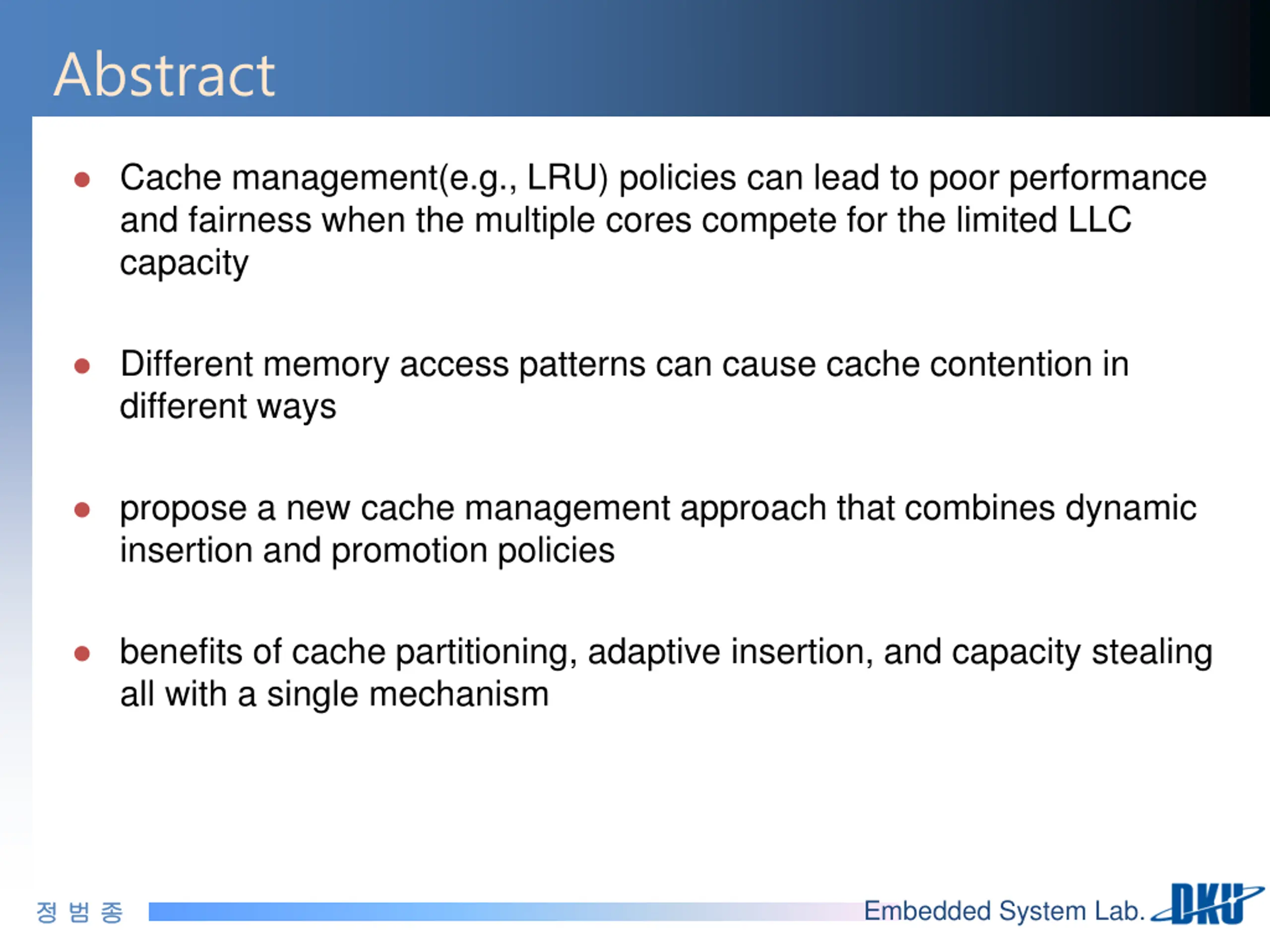 Abstract Cache management(e.g., LRU) policies can lead to poor performance and fairness when the multiple cores compete for the limited LLC capacity Different memory access patterns can cause cache contention in different ways propose a new cache management approach that combines dynamic insertion and promotion policies benefits of cache partitioning, adaptive insertion, and capacity stealing all with a single mechanism Embedded System Lab.