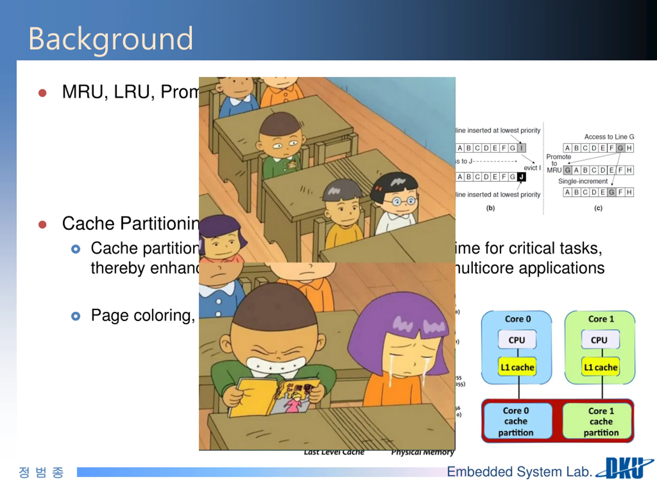 Background MRU, LRU, Promotion policies Cache Partitioning Cache partitioning reduces worst-case execution time for critical tasks, thereby enhancing CPU utilization, especially for multicore applications Page coloring, UCP Embedded System Lab.