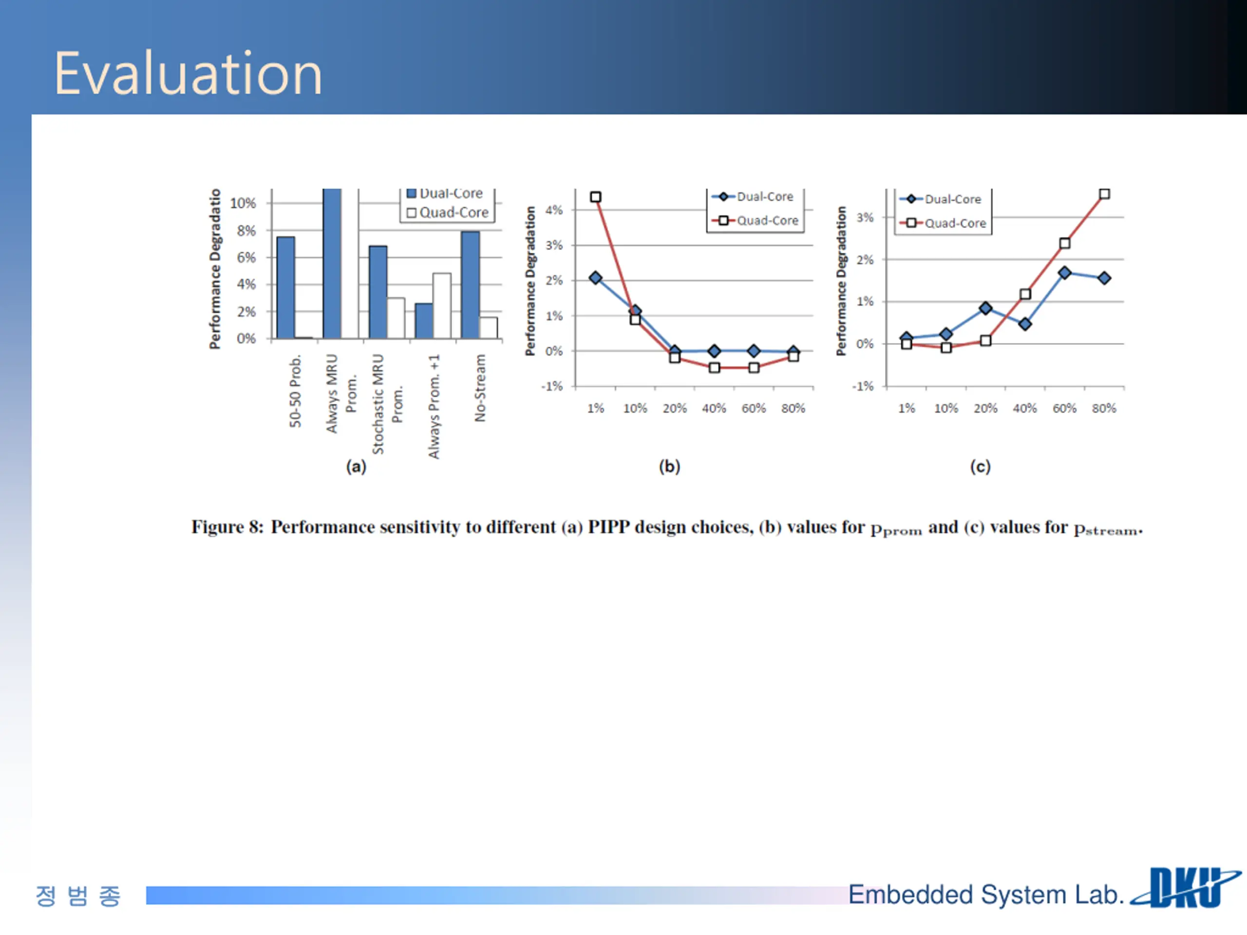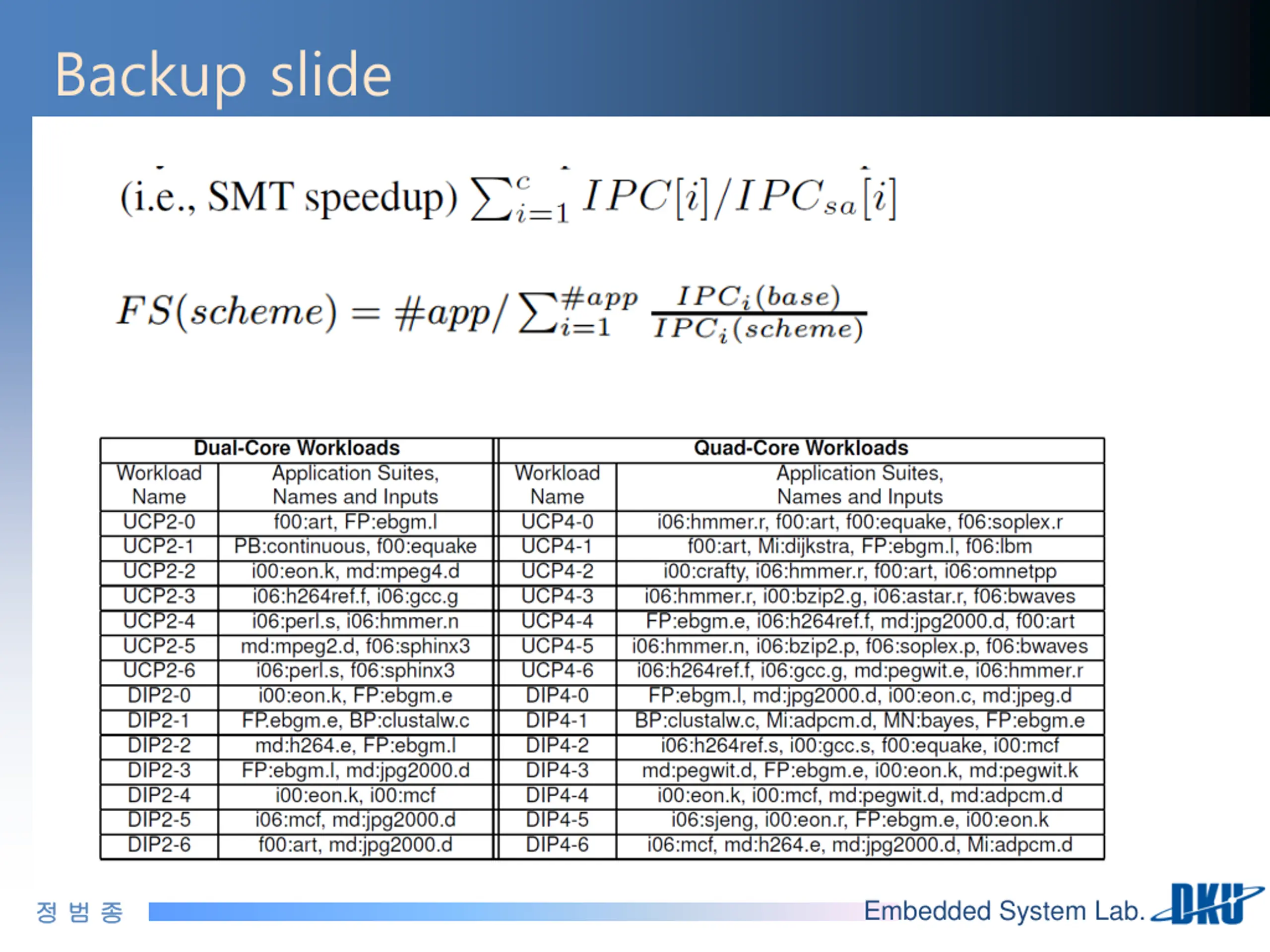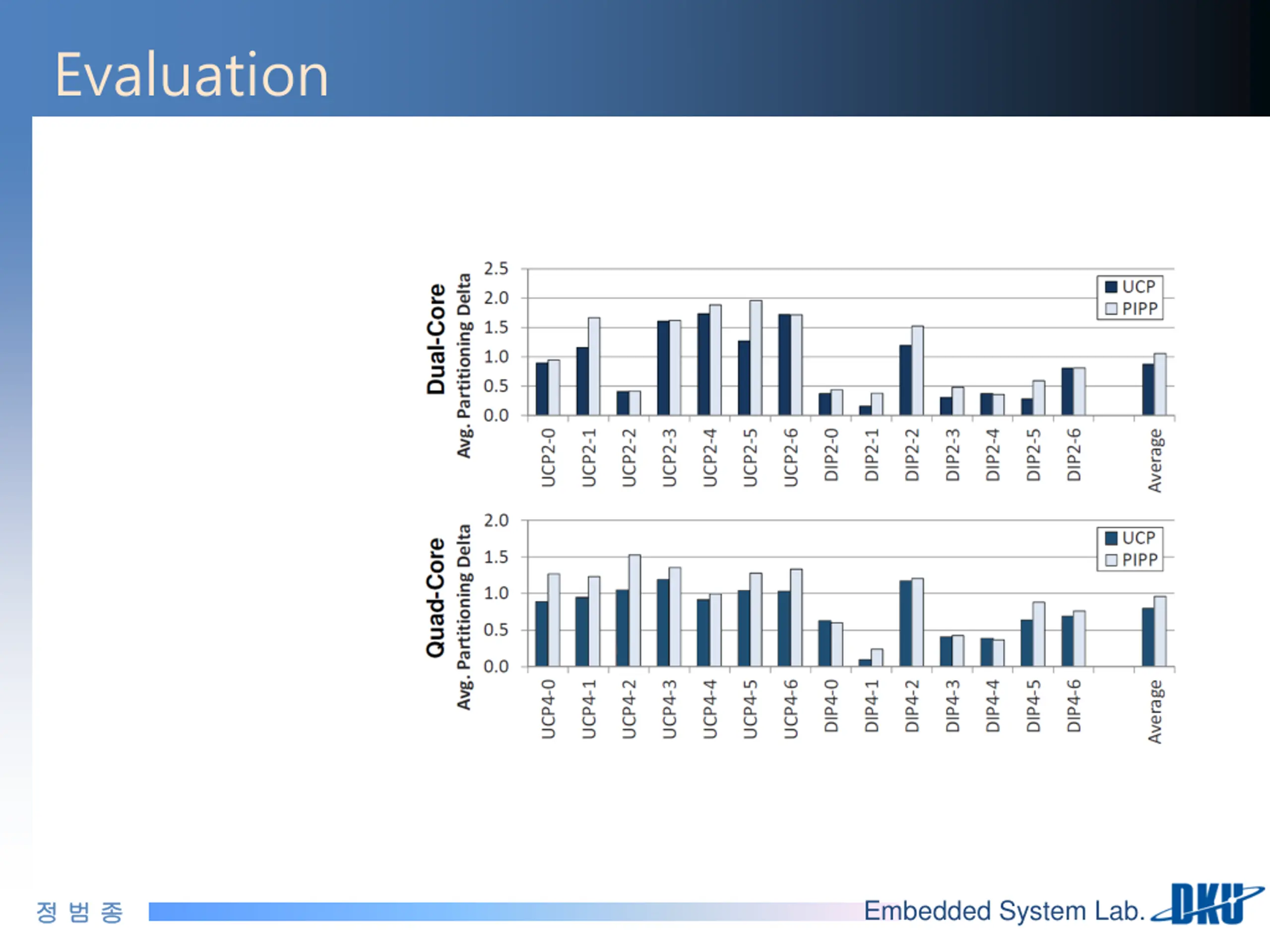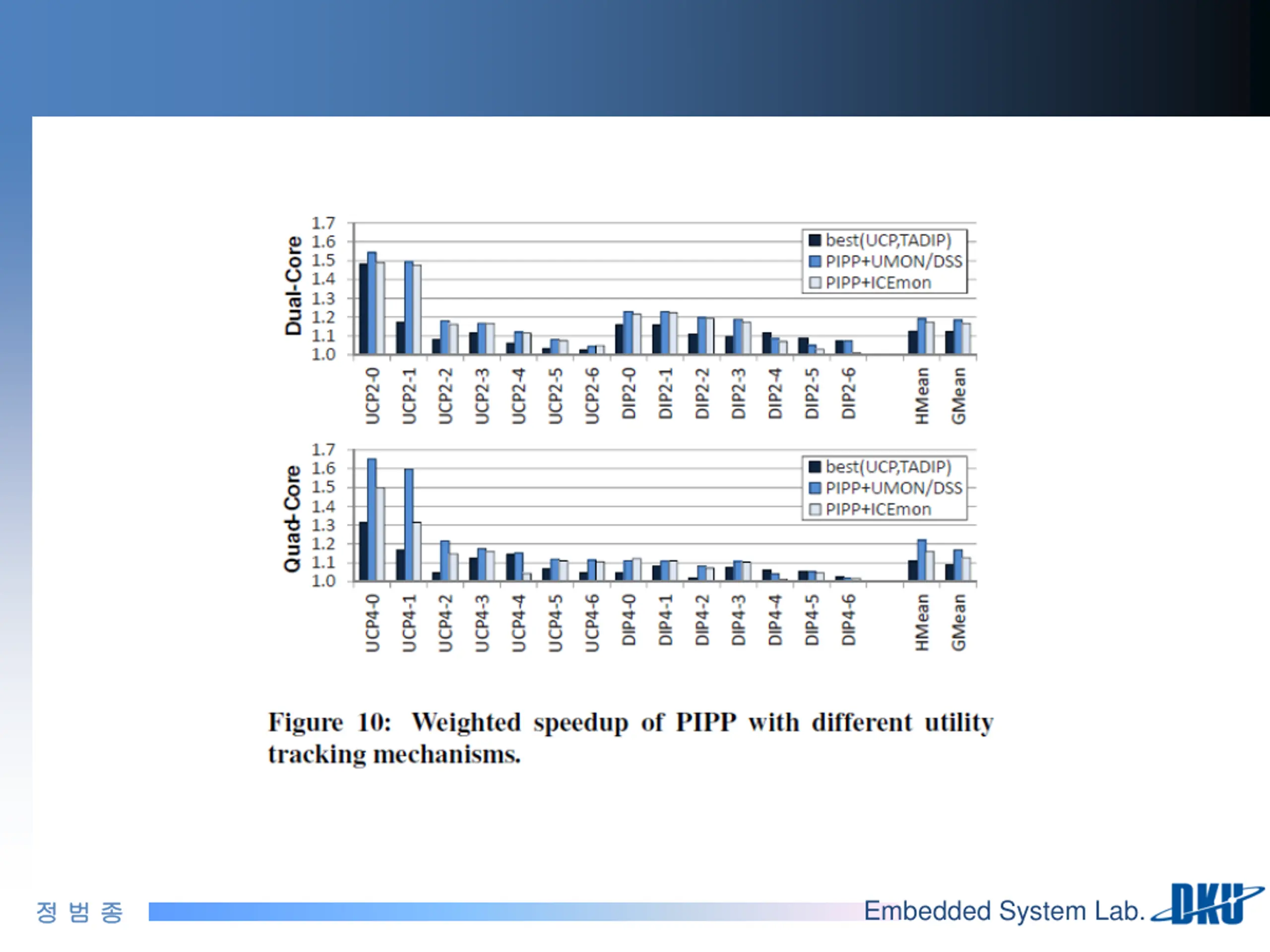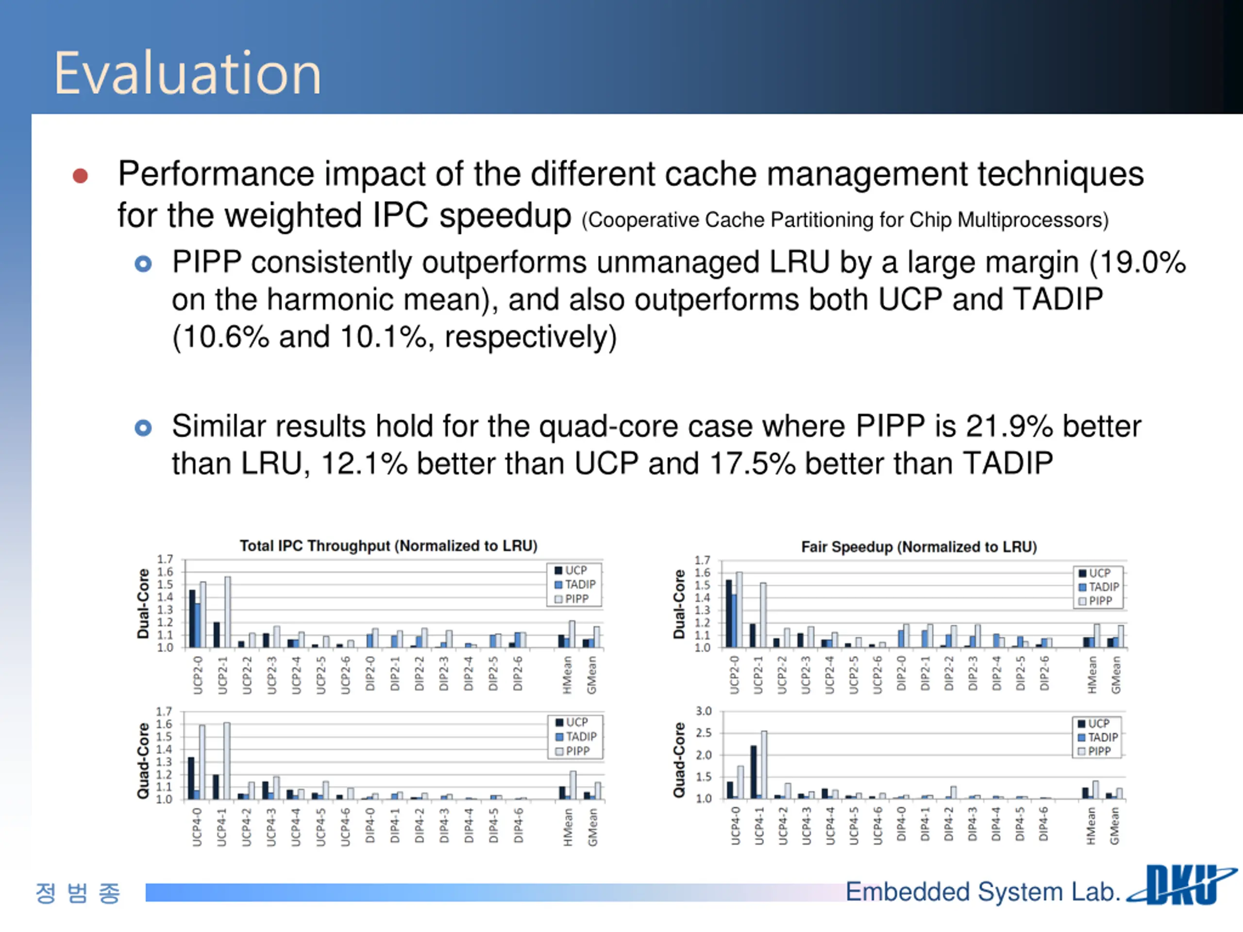 Evaluation Performance impact of the different cache management techniques for the weighted IPC speedup (Cooperative Cache Partitioning for Chip Multiprocessors) PIPP consistently outperforms unmanaged LRU by a large margin (19.0% on the harmonic mean), and also outperforms both UCP and TADIP (10.6% and 10.1%, respectively) Similar results hold for the quad-core case where PIPP is 21.9% better than LRU, 12.1% better than UCP and 17.5% better than TADIP Embedded System Lab.