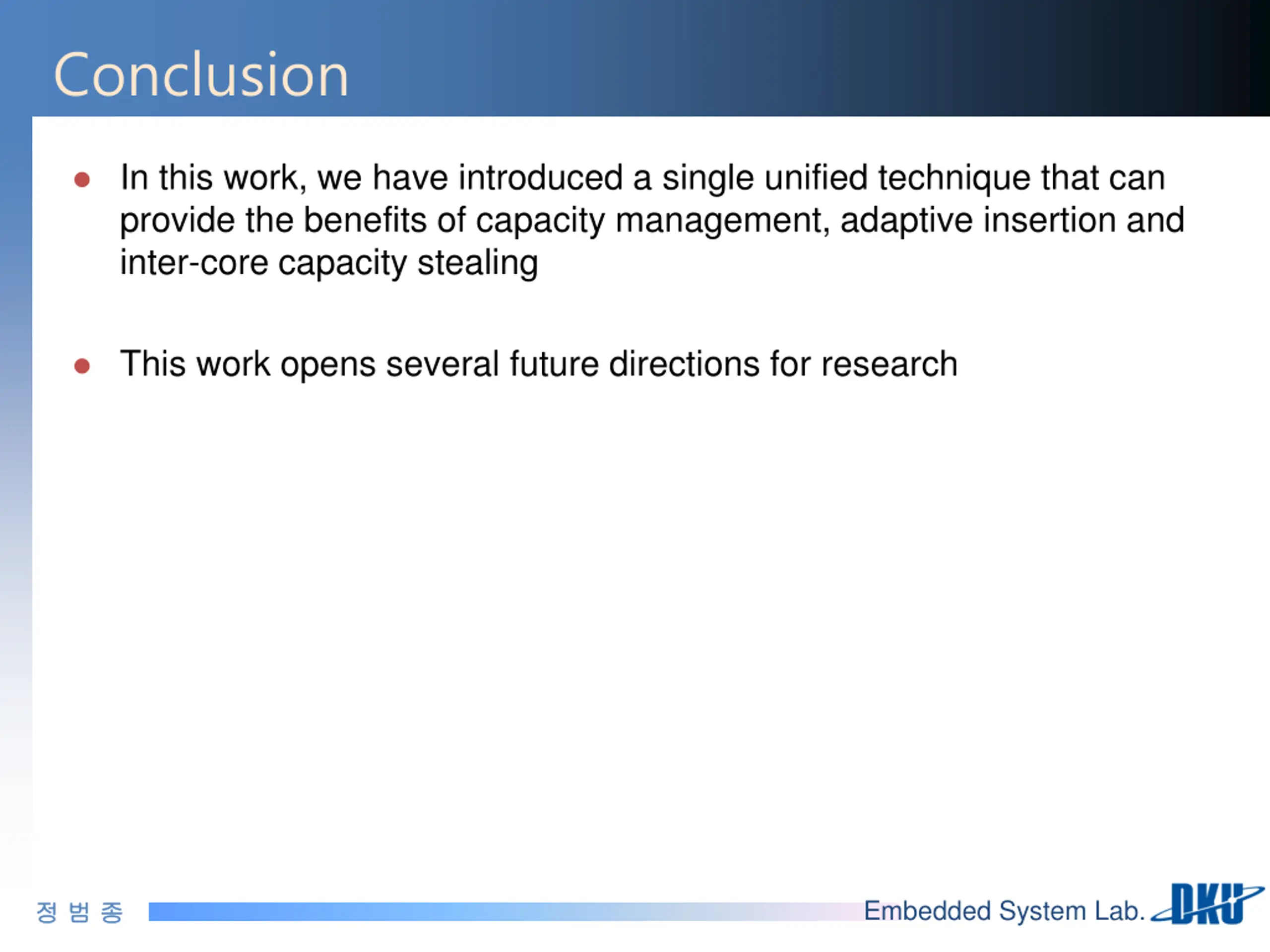 Conclusion In this work, we have introduced a single unified technique that can provide the benefits of capacity management, adaptive insertion and inter-core capacity stealing This work opens several future directions for research Embedded System Lab.