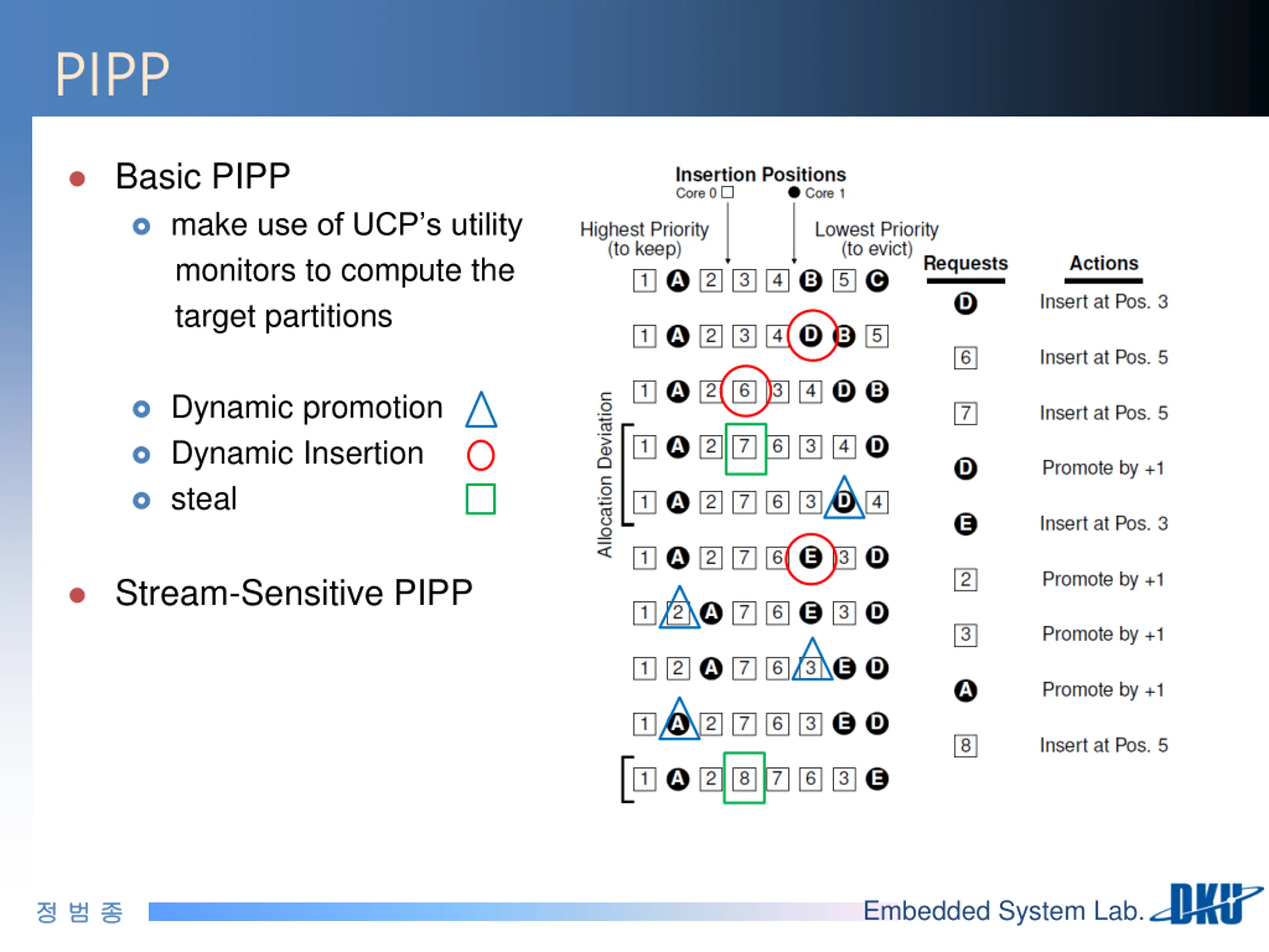 PIPP Basic PIPP make use of UCP s utility monitors to compute the target partitions Dynamic promotion Dynamic Insertion steal Stream-Sensitive PIPP Embedded System Lab.