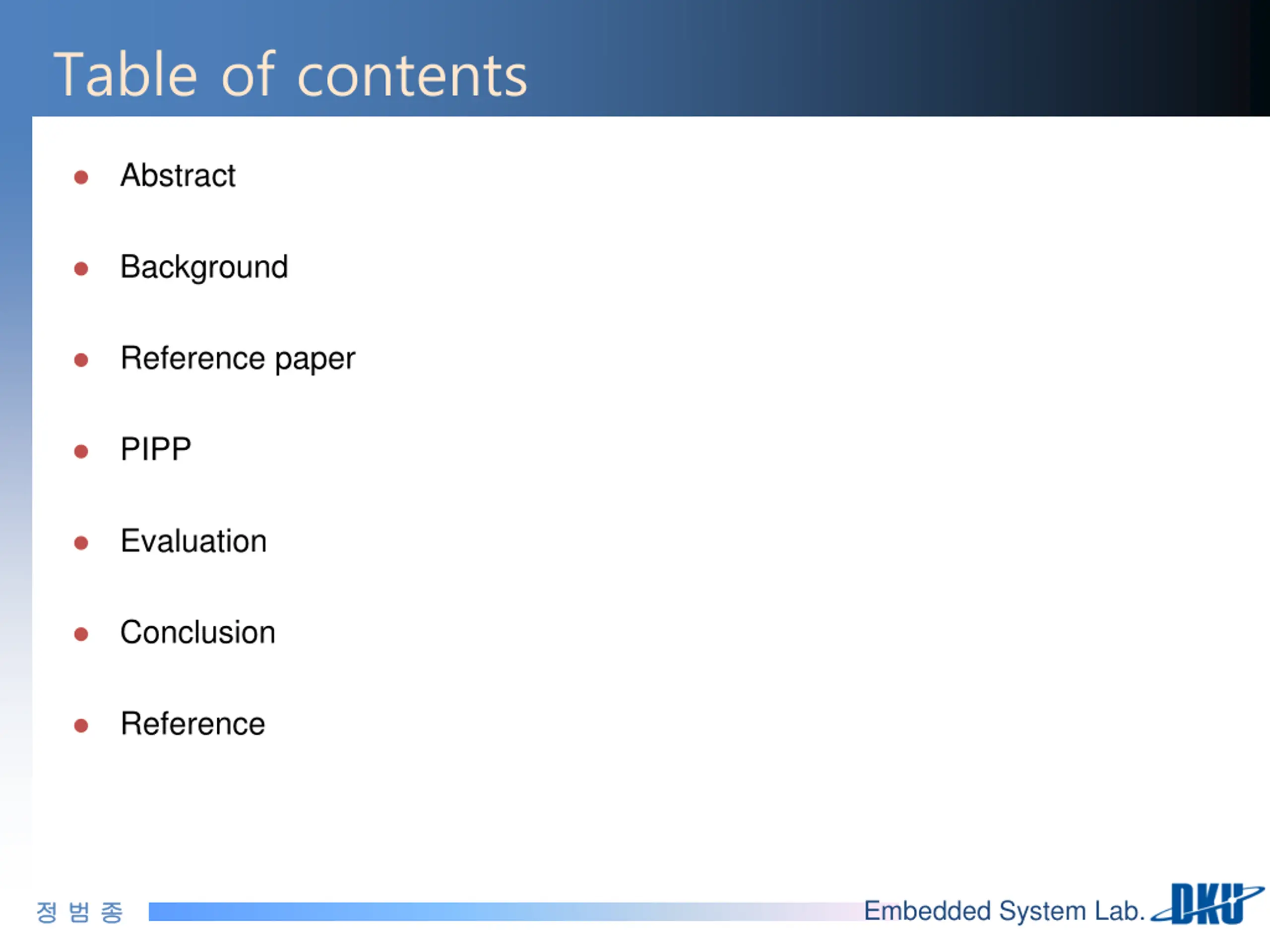 Table of contents Abstract Background Reference paper PIPP Evaluation Conclusion Reference Embedded System Lab.