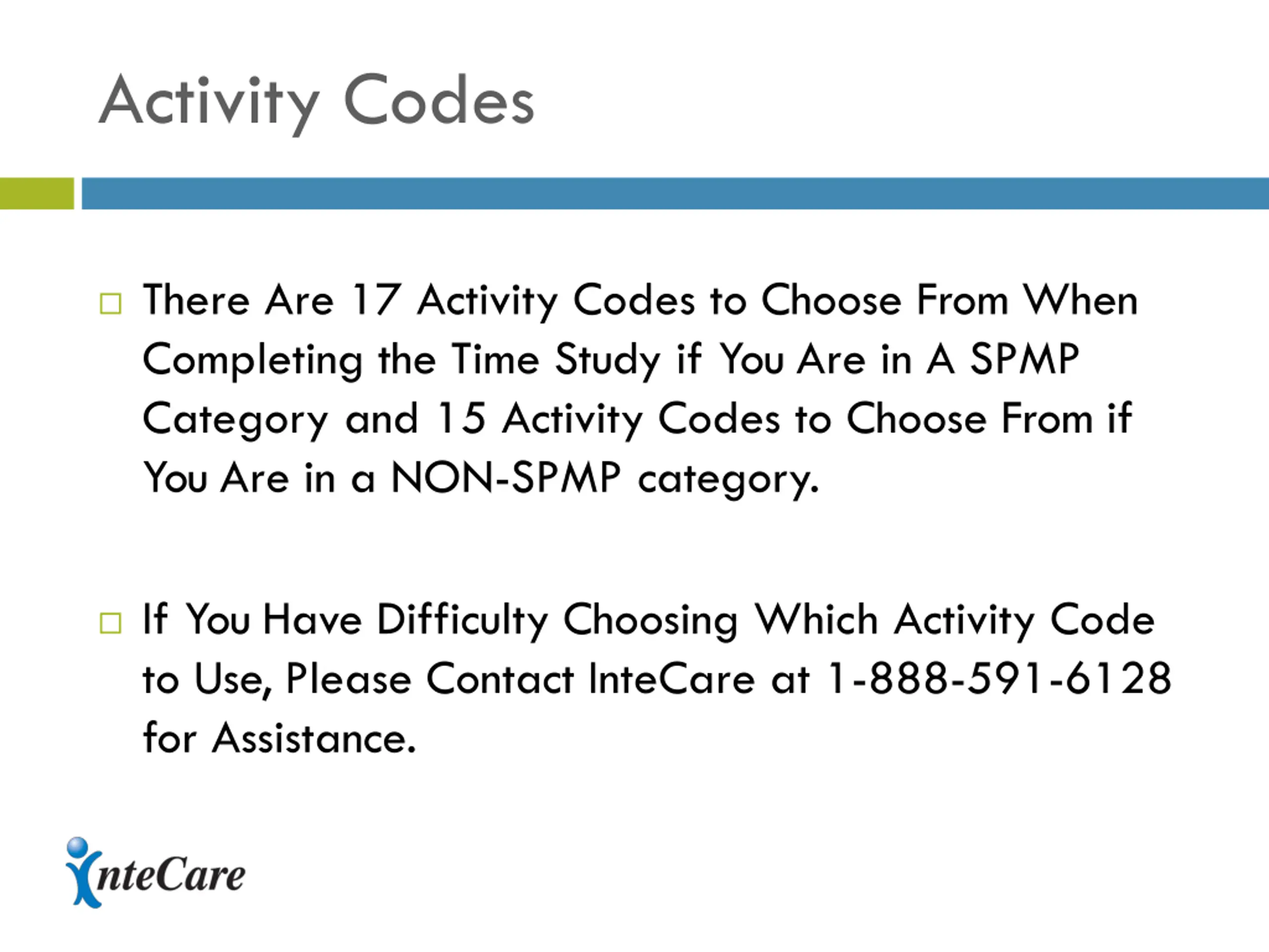 Activity Codes There Are 17 Activity Codes to Choose From When Completing the Time Study if You Are in A SPMP Category and 15 Activity Codes to Choose From if You Are in a NON-SPMP category. If You Have Difficulty Choosing Which Activity Code to Use, Please Contact InteCare at 1-888-591-6128 for Assistance.