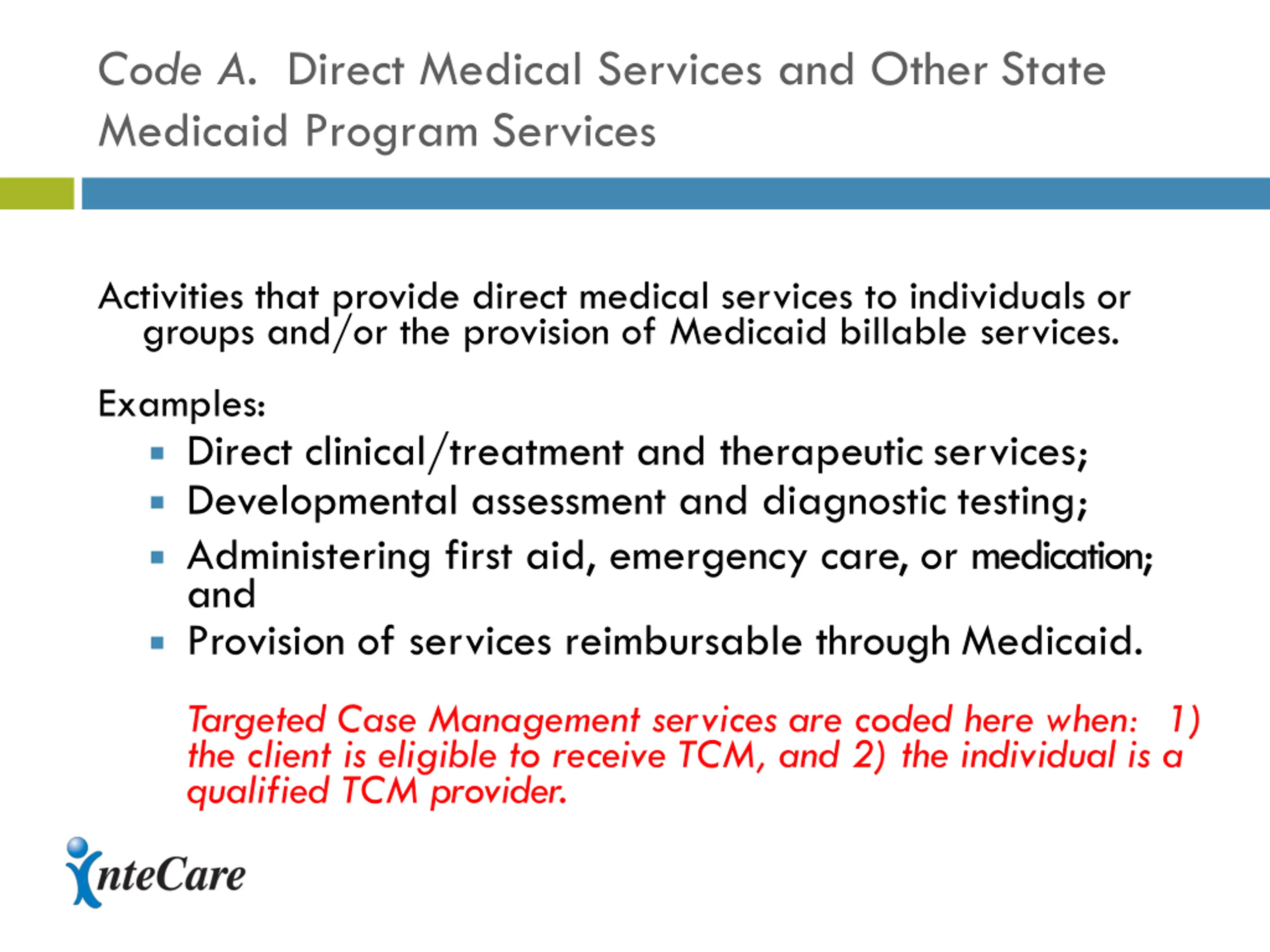 Code A. Direct Medical Services and Other State Medicaid Program Services Activities that provide direct medical services to individuals or groups and/or the provision of Medicaid billable services. Examples: Direct clinical/treatment and therapeutic services; Developmental assessment and diagnostic testing; Administering first aid, emergency care, or medication; and Provision of services reimbursable through Medicaid. Targeted Case Management services are coded here when: 1) the client is eligible to receive TCM, and 2) the individual is a qualified TCM provider.