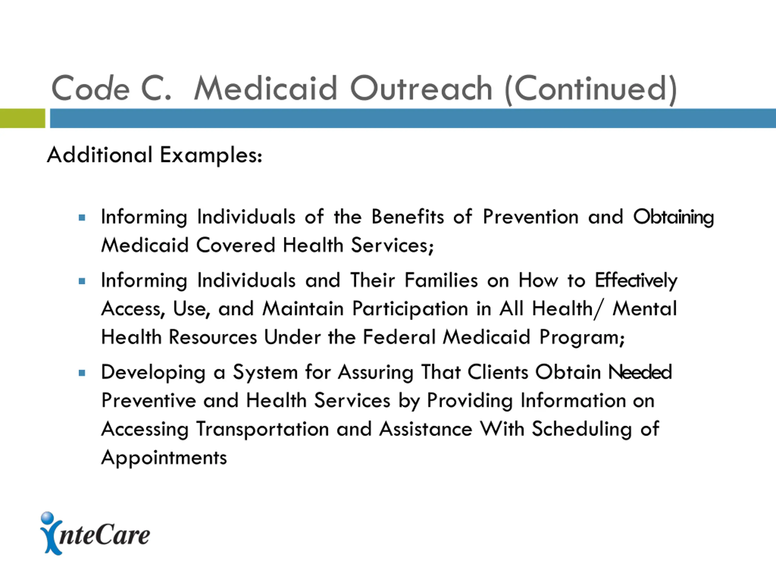 Code C. Medicaid Outreach (Continued) Additional Examples: Informing Individuals of the Benefits of Prevention and Obtaining Medicaid Covered Health Services; Informing Individuals and Their Families on How to Effectively Access, Use, and Maintain Participation in All Health/ Mental Health Resources Under the Federal Medicaid Program; Developing a System for Assuring That Clients Obtain Needed Preventive and Health Services by Providing Information on Accessing Transportation and Assistance With Scheduling of Appointments