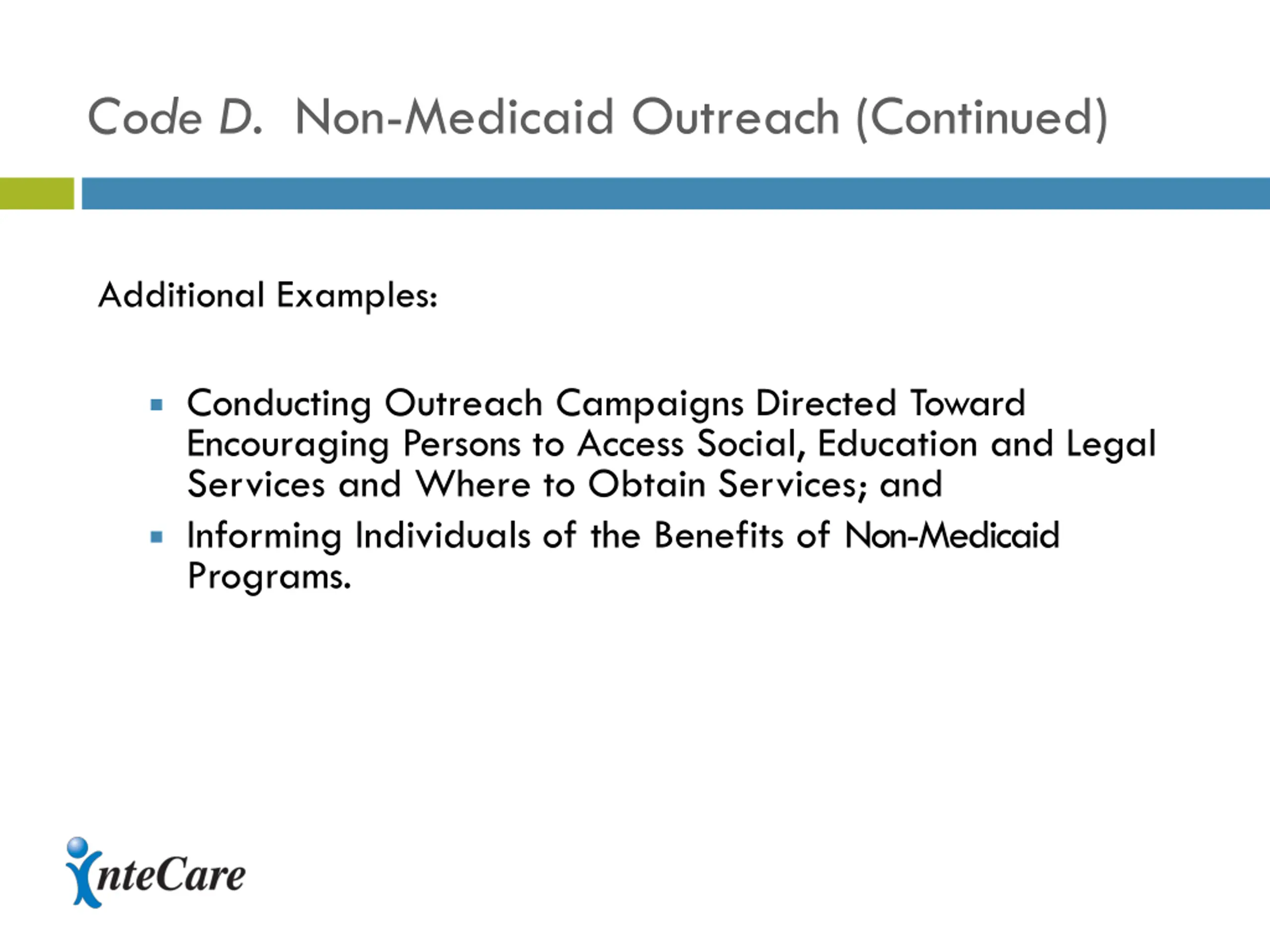 Code D. Non-Medicaid Outreach (Continued) Additional Examples: Conducting Outreach Campaigns Directed Toward Encouraging Persons to Access Social, Education and Legal Services and Where to Obtain Services; and Informing Individuals of the Benefits of Non-Medicaid Programs.