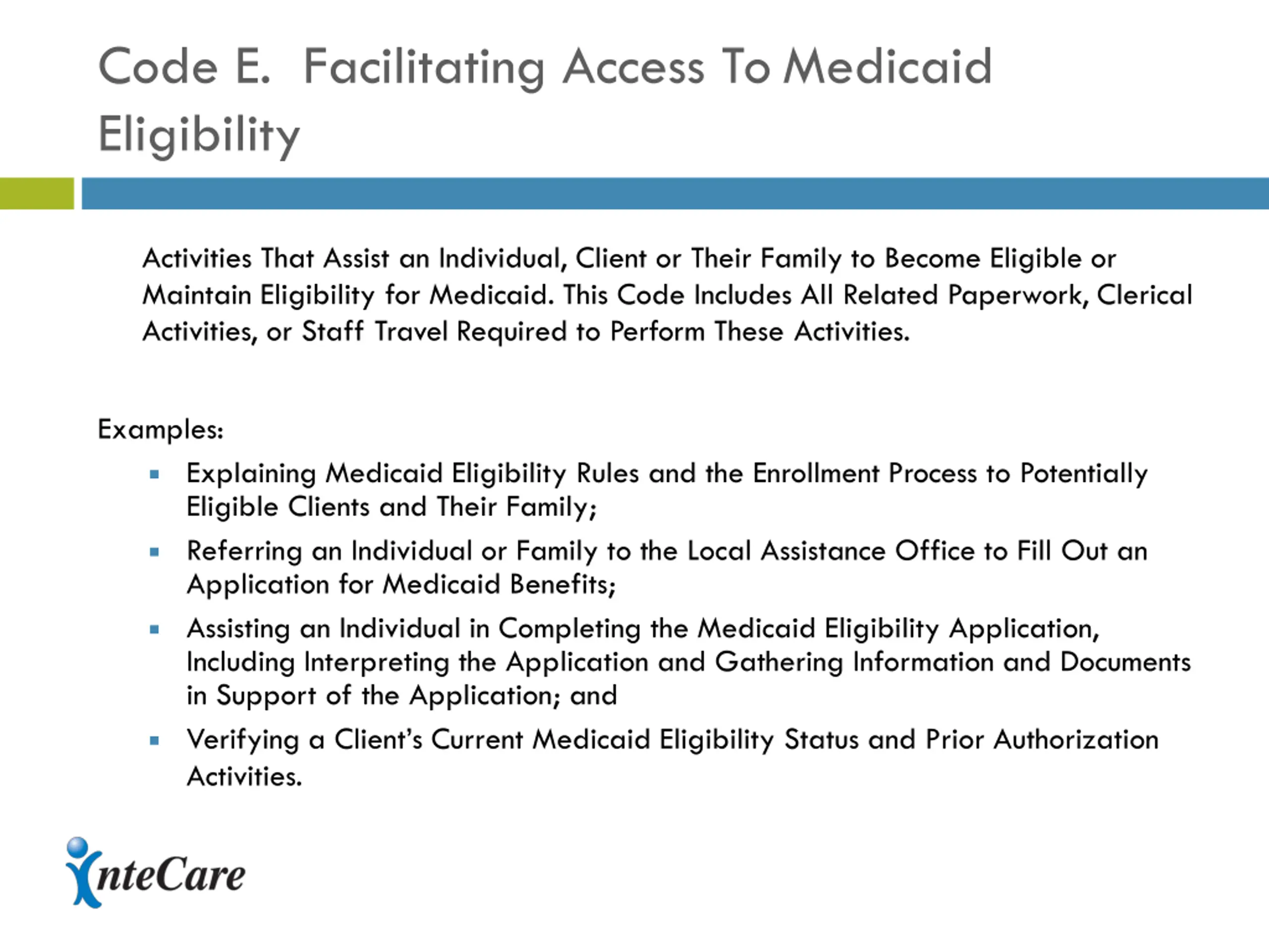 Code E. Facilitating Access To Medicaid Eligibility Activities That Assist an Individual, Client or Their Family to Become Eligible or Maintain Eligibility for Medicaid. This Code Includes All Related Paperwork, Clerical Activities, or Staff Travel Required to Perform These Activities. Examples: Explaining Medicaid Eligibility Rules and the Enrollment Process to Potentially Eligible Clients and Their Family; Referring an Individual or Family to the Local Assistance Office to Fill Out an Application for Medicaid Benefits; Assisting an Individual in Completing the Medicaid Eligibility Application, Including Interpreting the Application and Gathering Information and Documents in Support of the Application; and Verifying a Client s Current Medicaid Eligibility Status and Prior Authorization Activities.