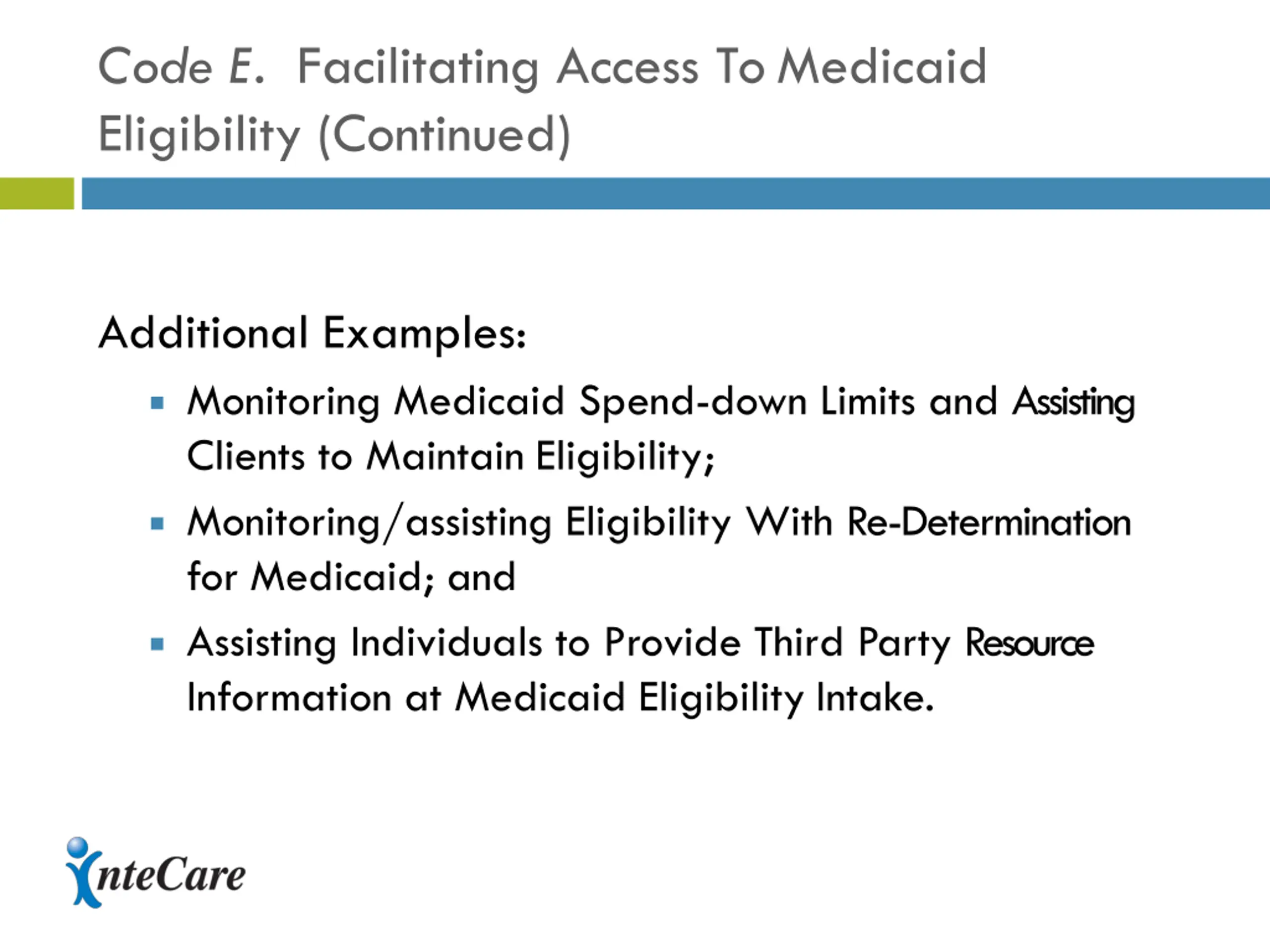 Code E. Facilitating Access To Medicaid Eligibility (Continued) Additional Examples: Monitoring Medicaid Spend-down Limits and Assisting Clients to Maintain Eligibility; Monitoring/assisting Eligibility With Re-Determination for Medicaid; and Assisting Individuals to Provide Third Party Resource Information at Medicaid Eligibility Intake.