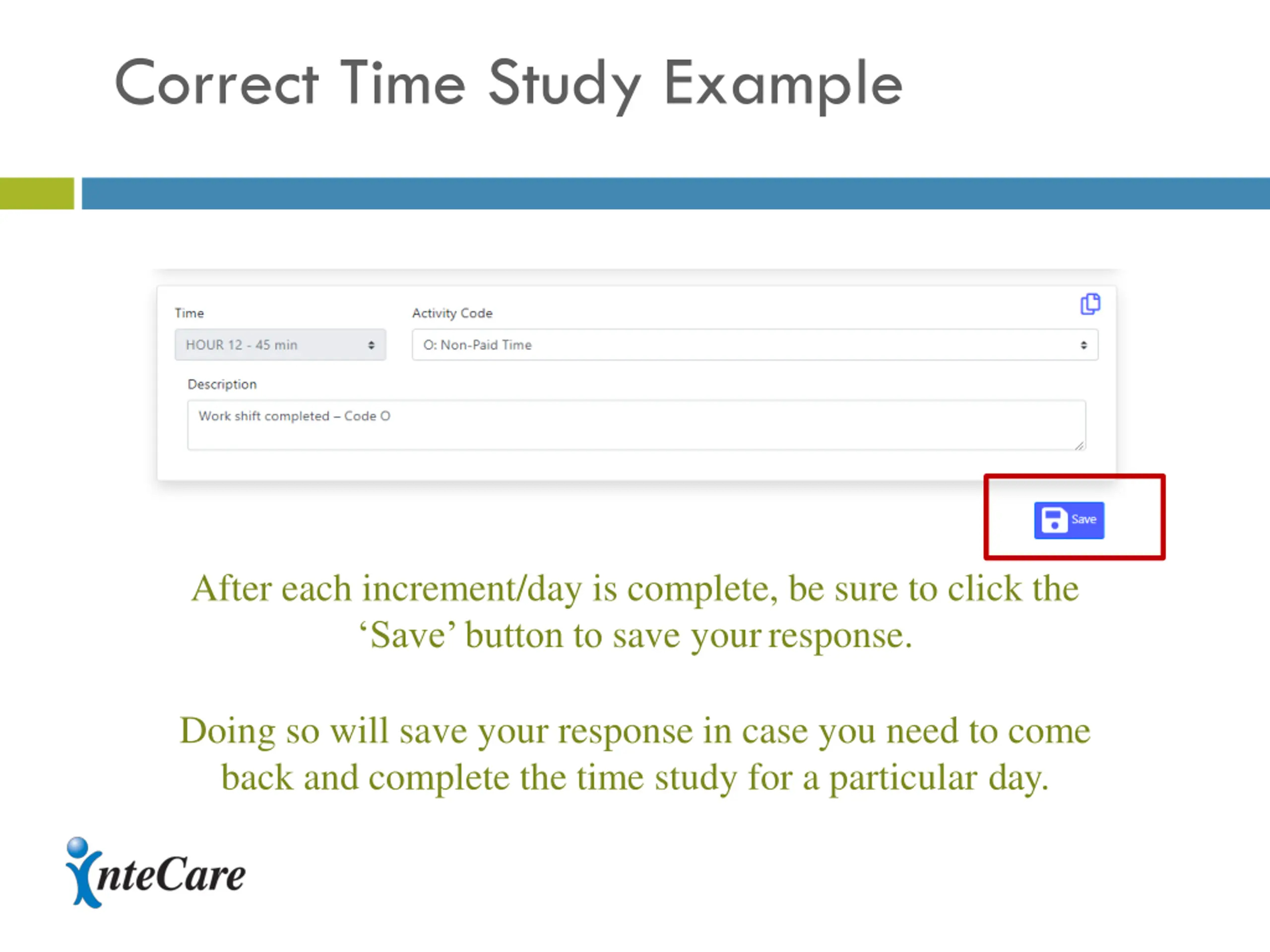 Correct Time Study Example After each increment/day is complete, be sure to click the Save button to save yourresponse. Doing so will save your response in case you need to come back and complete the time study for a particular day.
