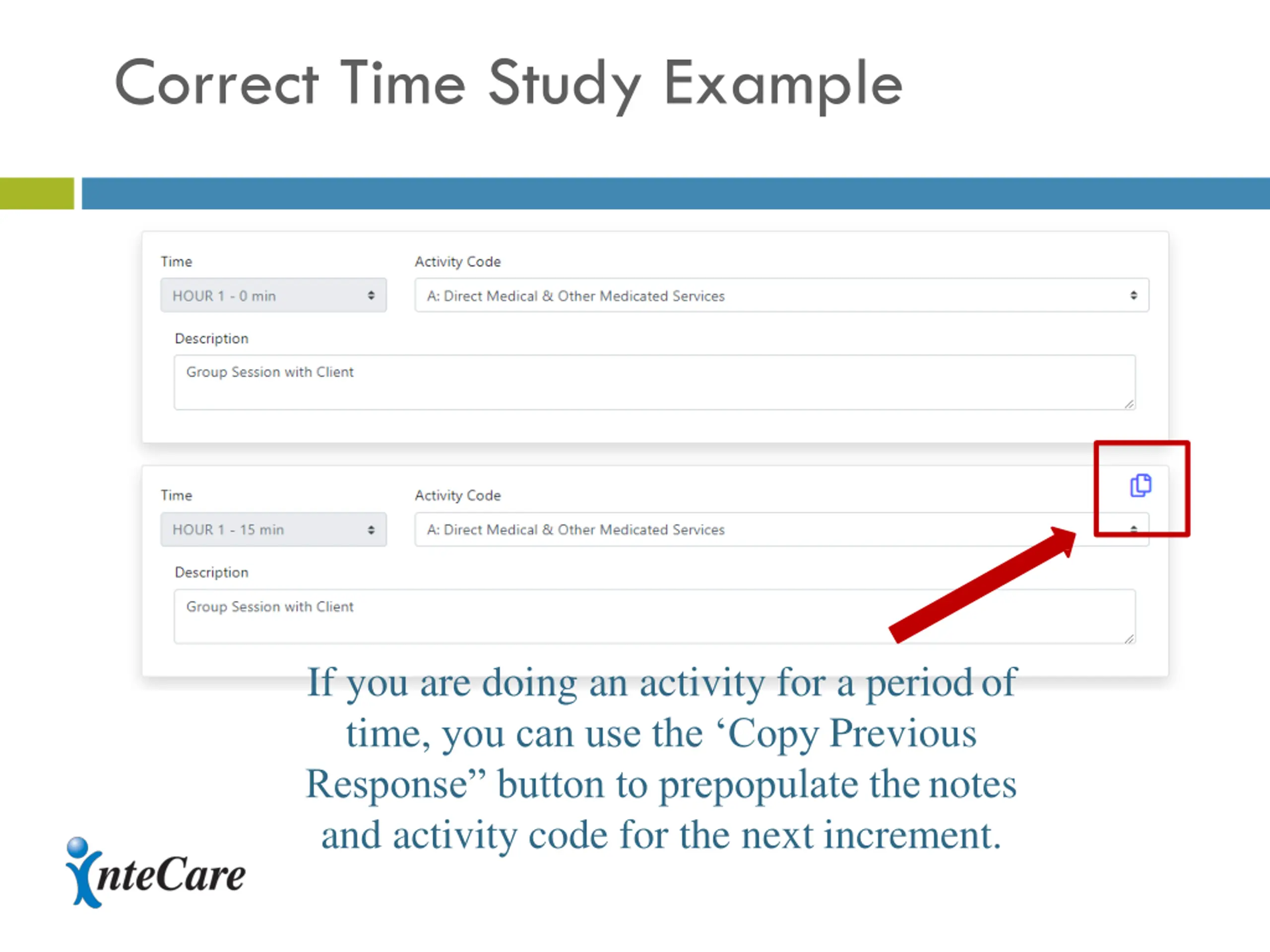 Correct Time Study Example If you are doing an activity for a periodof time, you can use the Copy Previous Response button to prepopulate thenotes and activity code for the next increment.