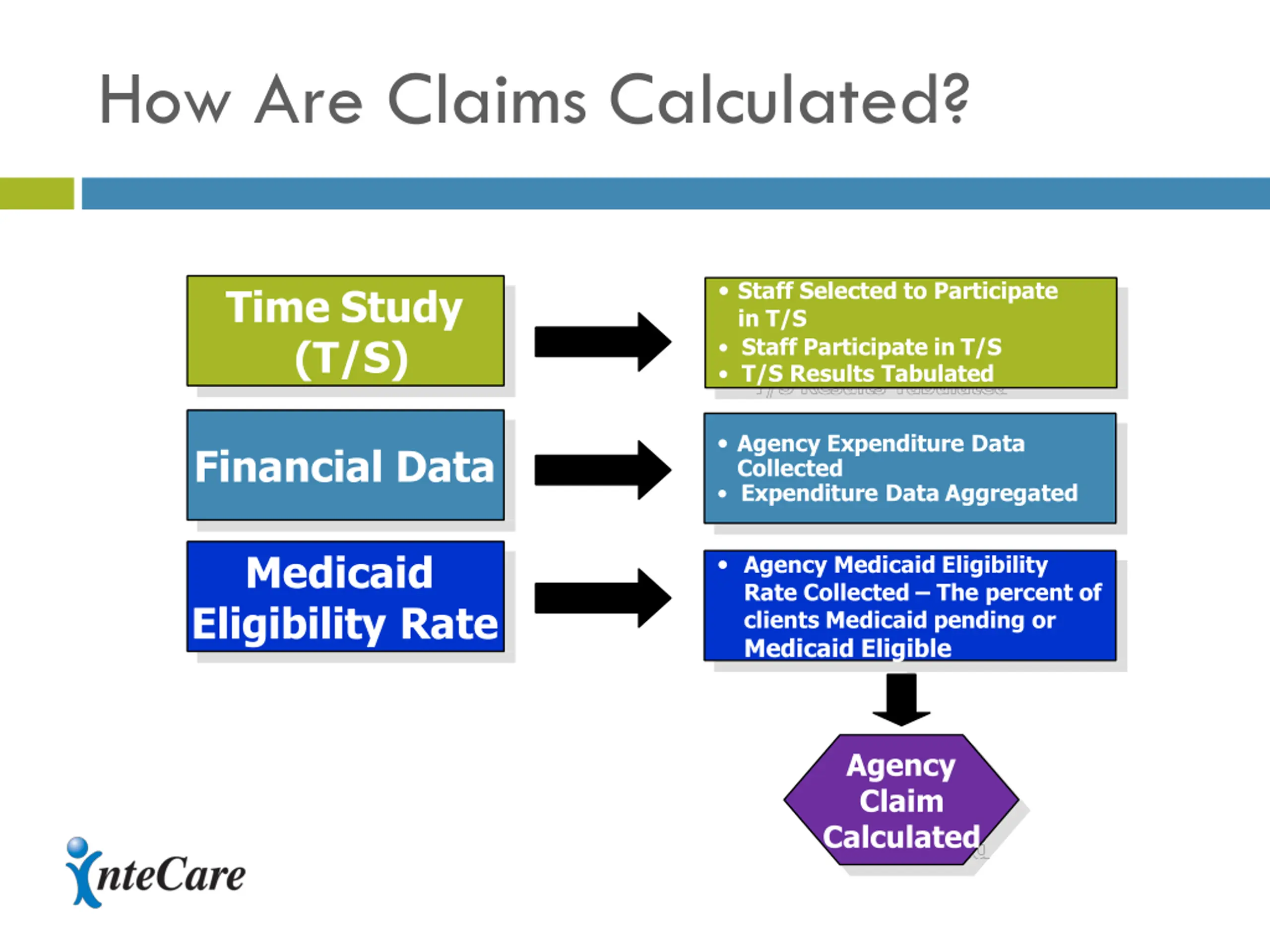 How Are Claims Calculated? Staff Selected to Participate in T/S Staff Participate in T/S T/S Results Tabulated Time Study (T/S) Agency Expenditure Data Collected Expenditure Data Aggregated Financial Data Medicaid Eligibility Rate Agency Medicaid Eligibility Rate Collected The percent of clients Medicaid pending or Medicaid Eligible Agency Claim Calculated
