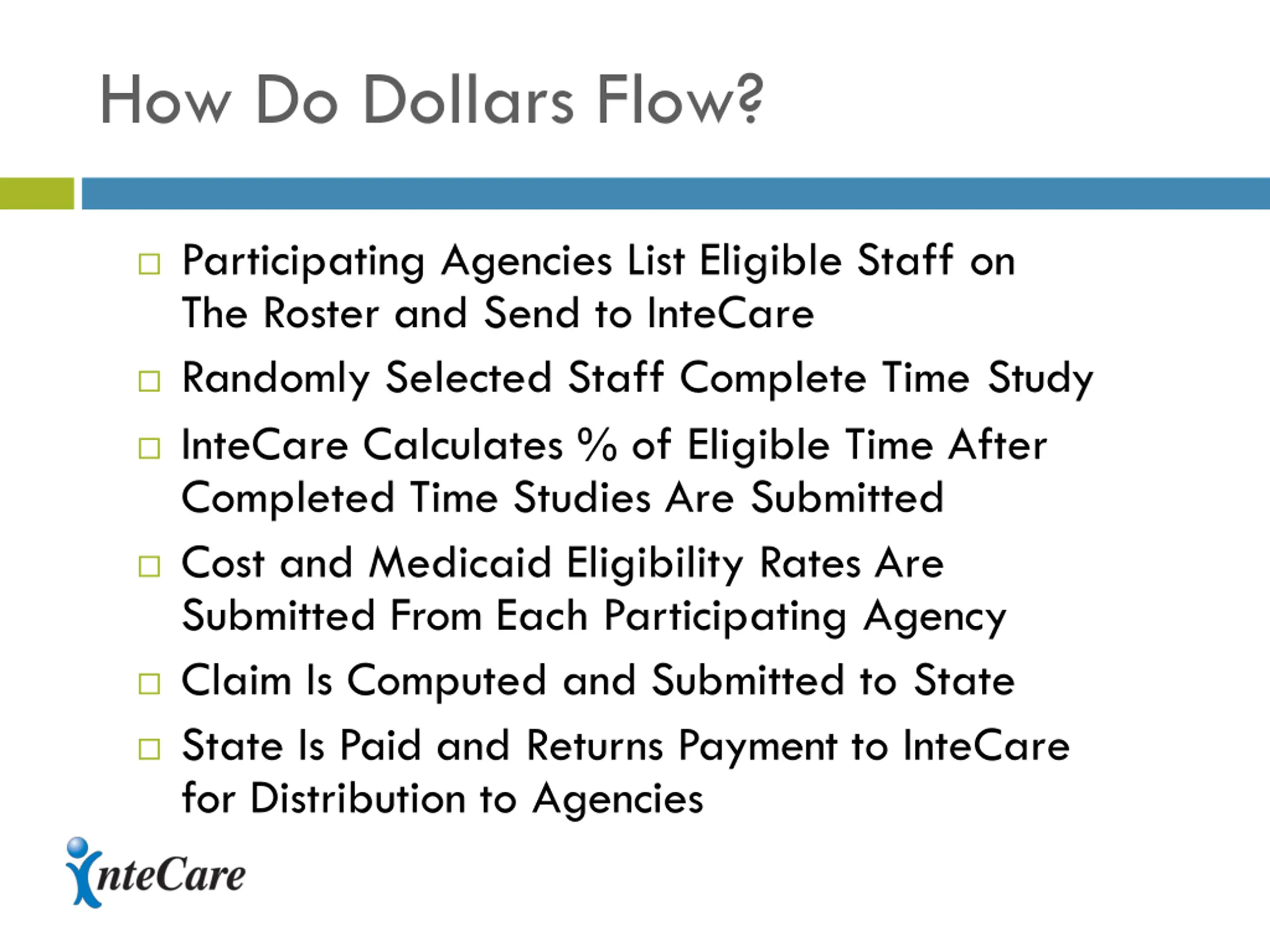 How Do Dollars Flow? Participating Agencies List Eligible Staff on The Roster and Send to InteCare Randomly Selected Staff Complete Time Study InteCare Calculates % of Eligible Time After Completed Time Studies Are Submitted Cost and Medicaid Eligibility Rates Are Submitted From Each Participating Agency Claim Is Computed and Submitted to State State Is Paid and Returns Payment to InteCare for Distribution to Agencies