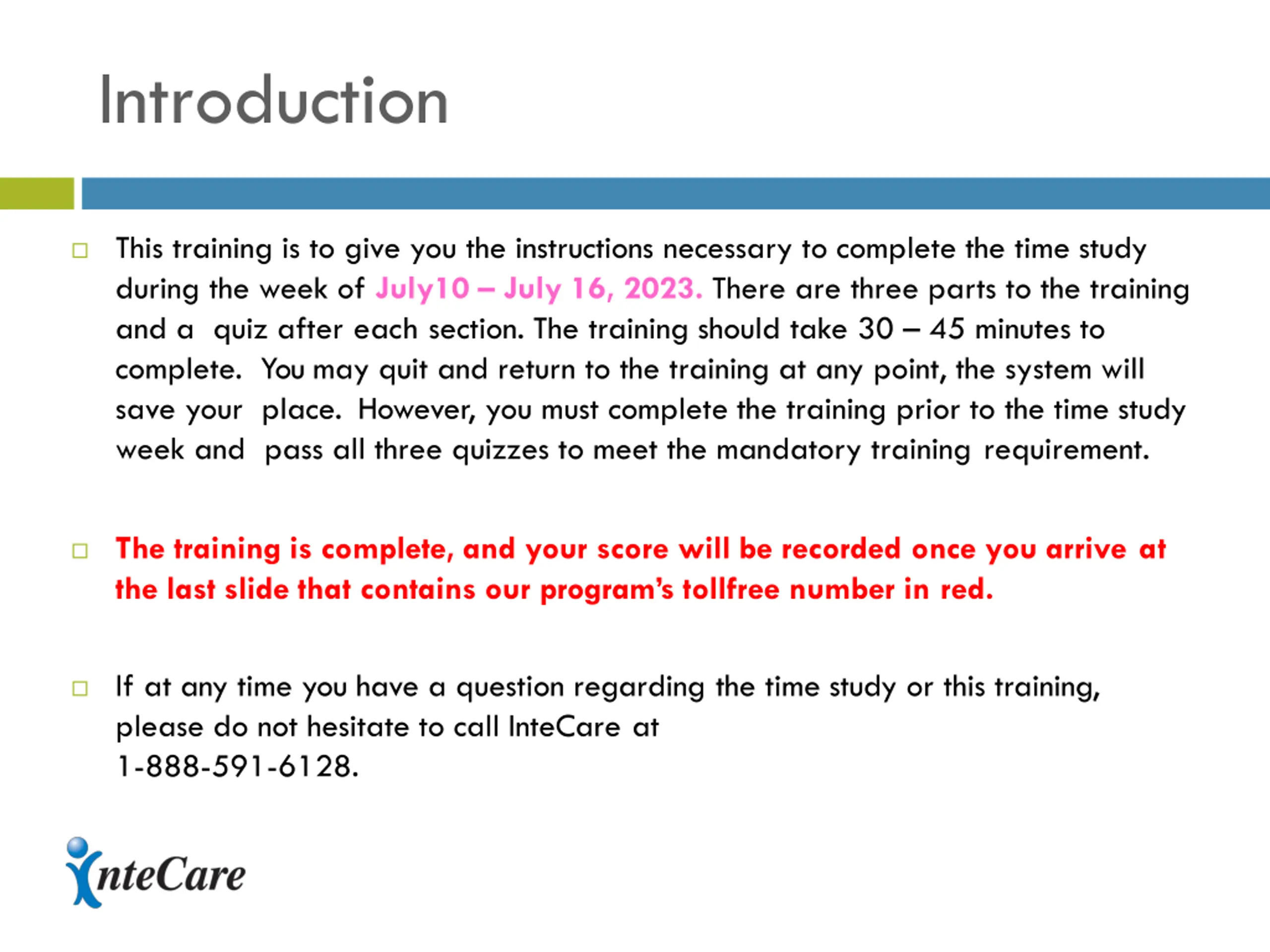 Introduction This training is to give you the instructions necessary to complete the time study during the week of July10 July 16, 2023. There are three parts to the training and a quiz after each section. The training should take 30 45 minutes to complete. You may quit and return to the training at any point, the system will save your place. However, you must complete the training prior to the time study week and pass all three quizzes to meet the mandatory training requirement. The training is complete, and your score will be recorded once you arrive at the last slide that contains our program s tollfree number in red. If at any time you have a question regarding the time study or this training, please do not hesitate to call InteCare at 1-888-591-6128.