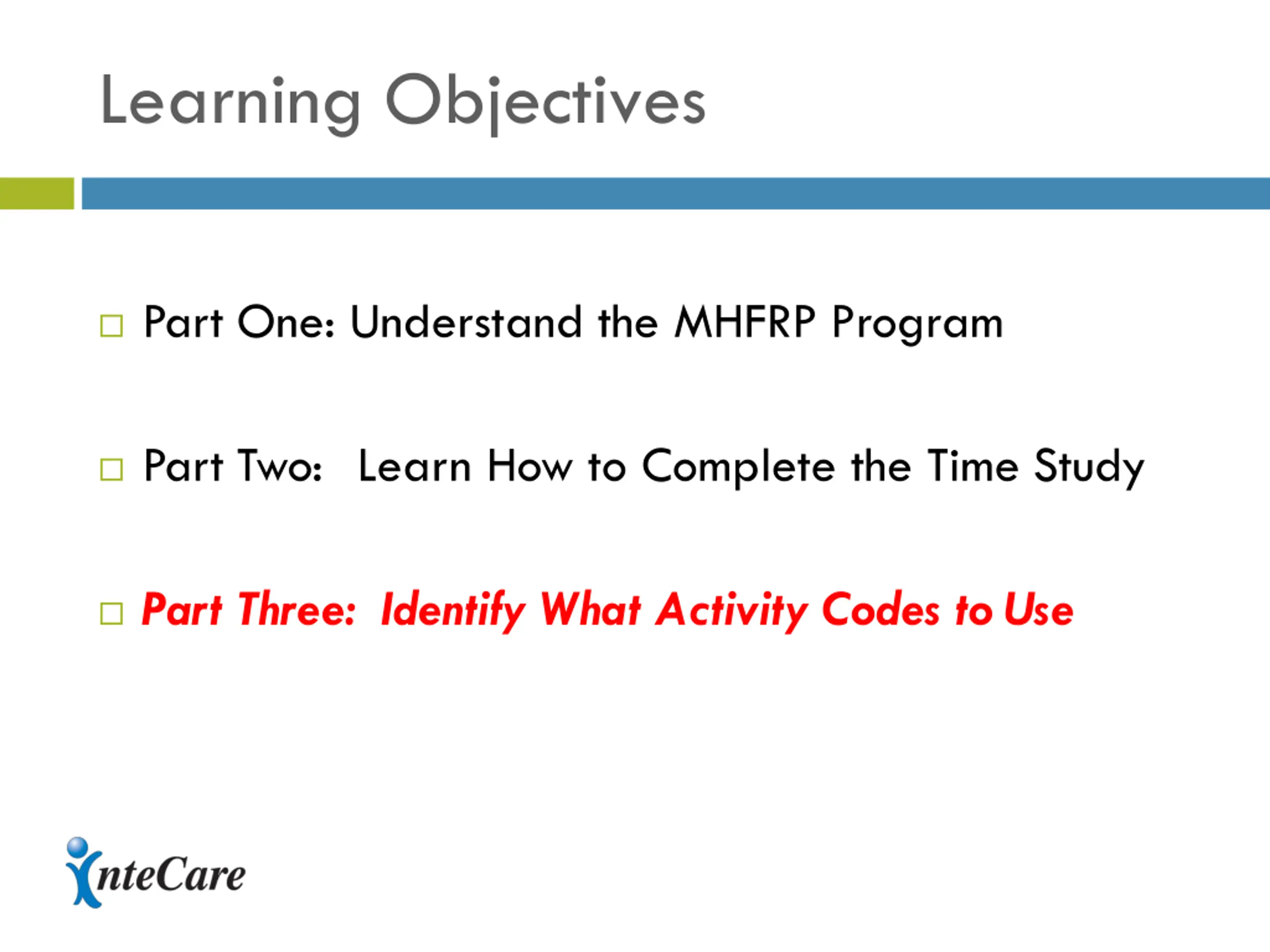 Learning Objectives Part One: Understand the MHFRP Program Part Two: Learn How to Complete the Time Study Part Three: Identify What Activity Codes to Use