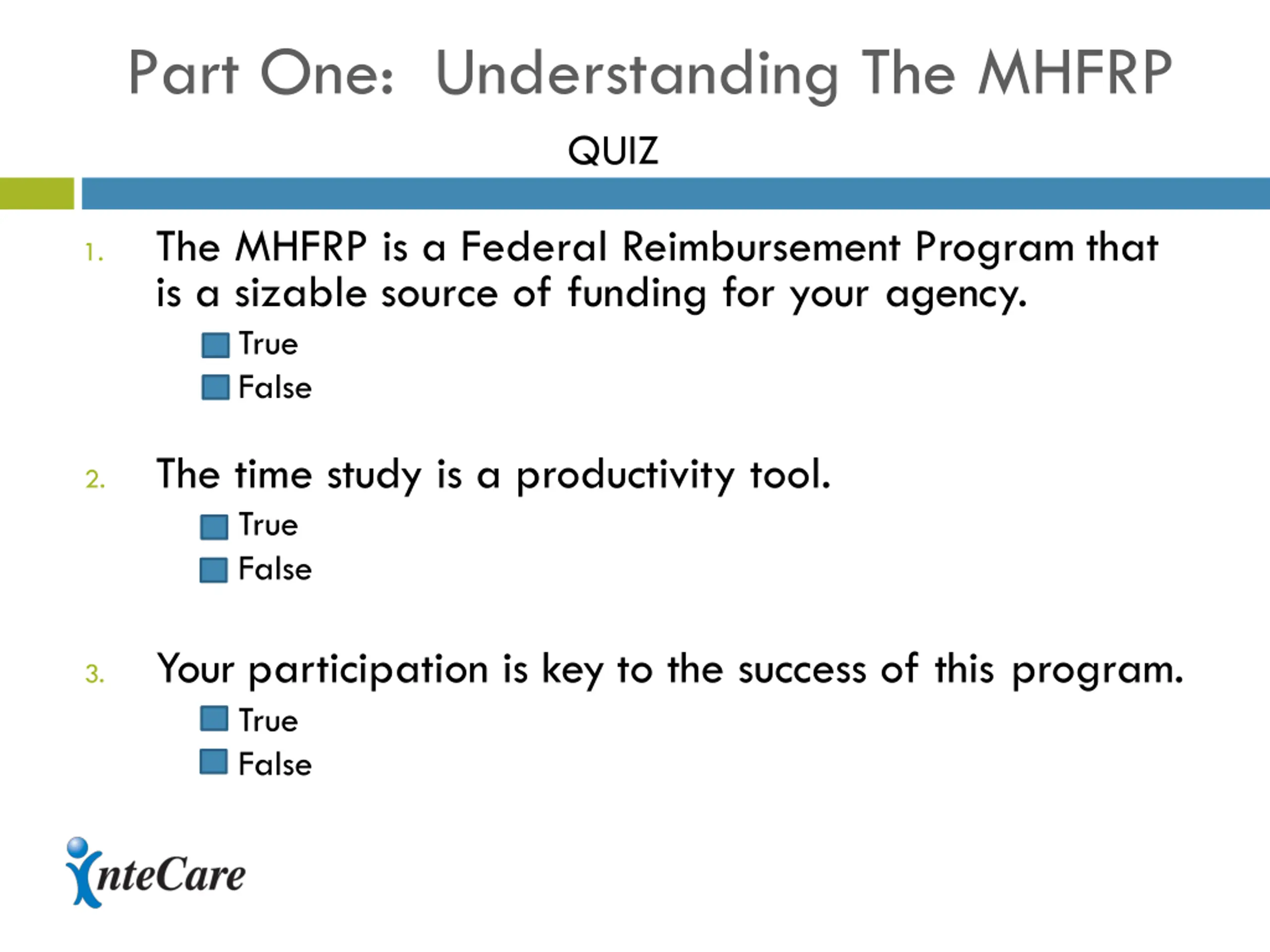 Part One: Understanding The MHFRP QUIZ The MHFRP is a Federal Reimbursement Program that is a sizable source of funding for your agency. True False 1. The time study is a productivity tool. True False 2. Your participation is key to the success of this program. True False 3.