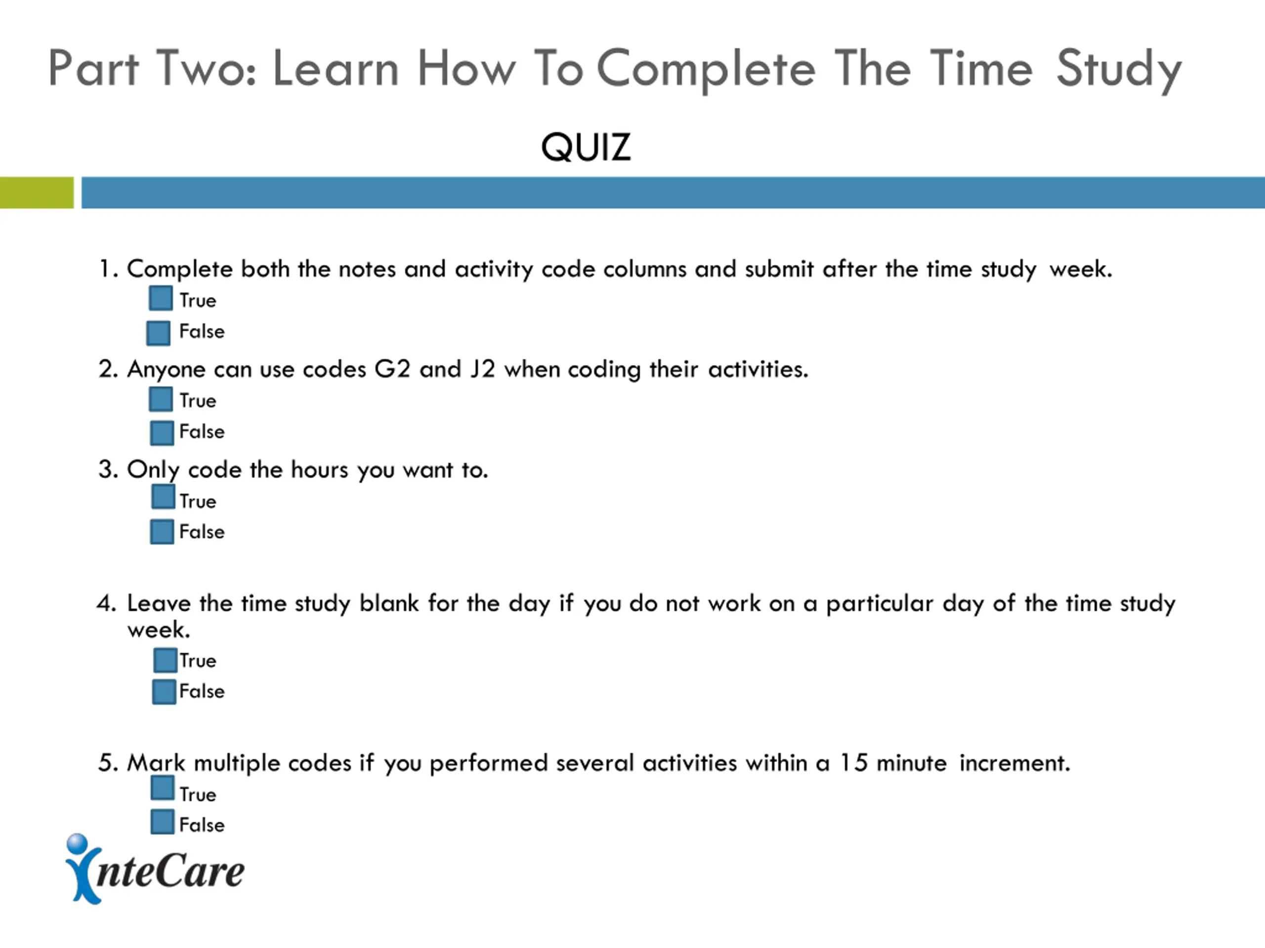 Part Two: Learn How To Complete The Time Study QUIZ 1. Complete both the notes and activity code columns and submit after the time study week. True False 2. Anyone can use codes G2 and J2 when coding their activities. True False 3. Only code the hours you want to. True False 4. Leave the time study blank for the day if you do not work on a particular day of the time study week. True False 5. Mark multiple codes if you performed several activities within a 15 minute increment. True False