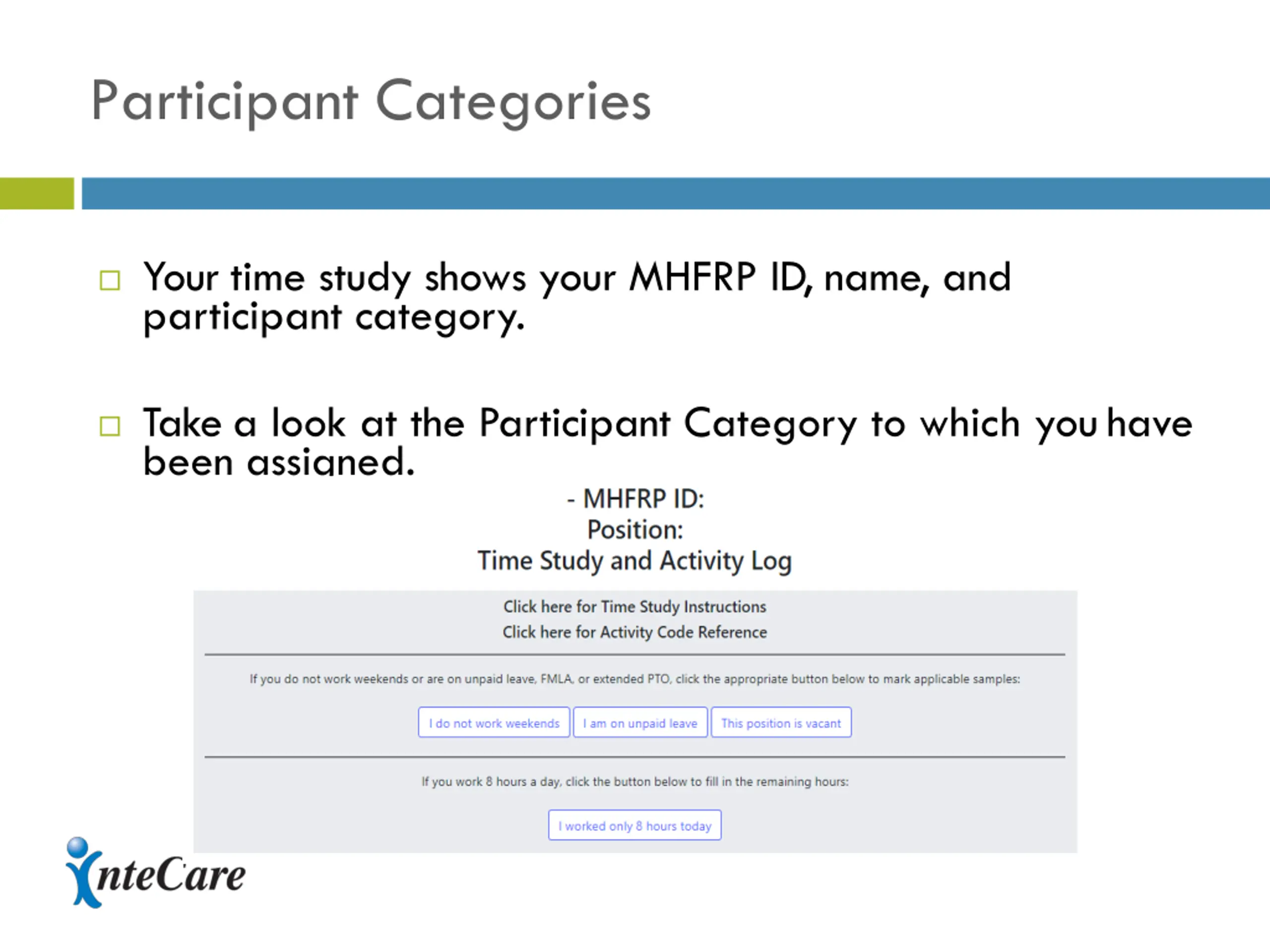 Participant Categories Your time study shows your MHFRP ID, name, and participant category. Take a look at the Participant Category to which youhave been assigned.