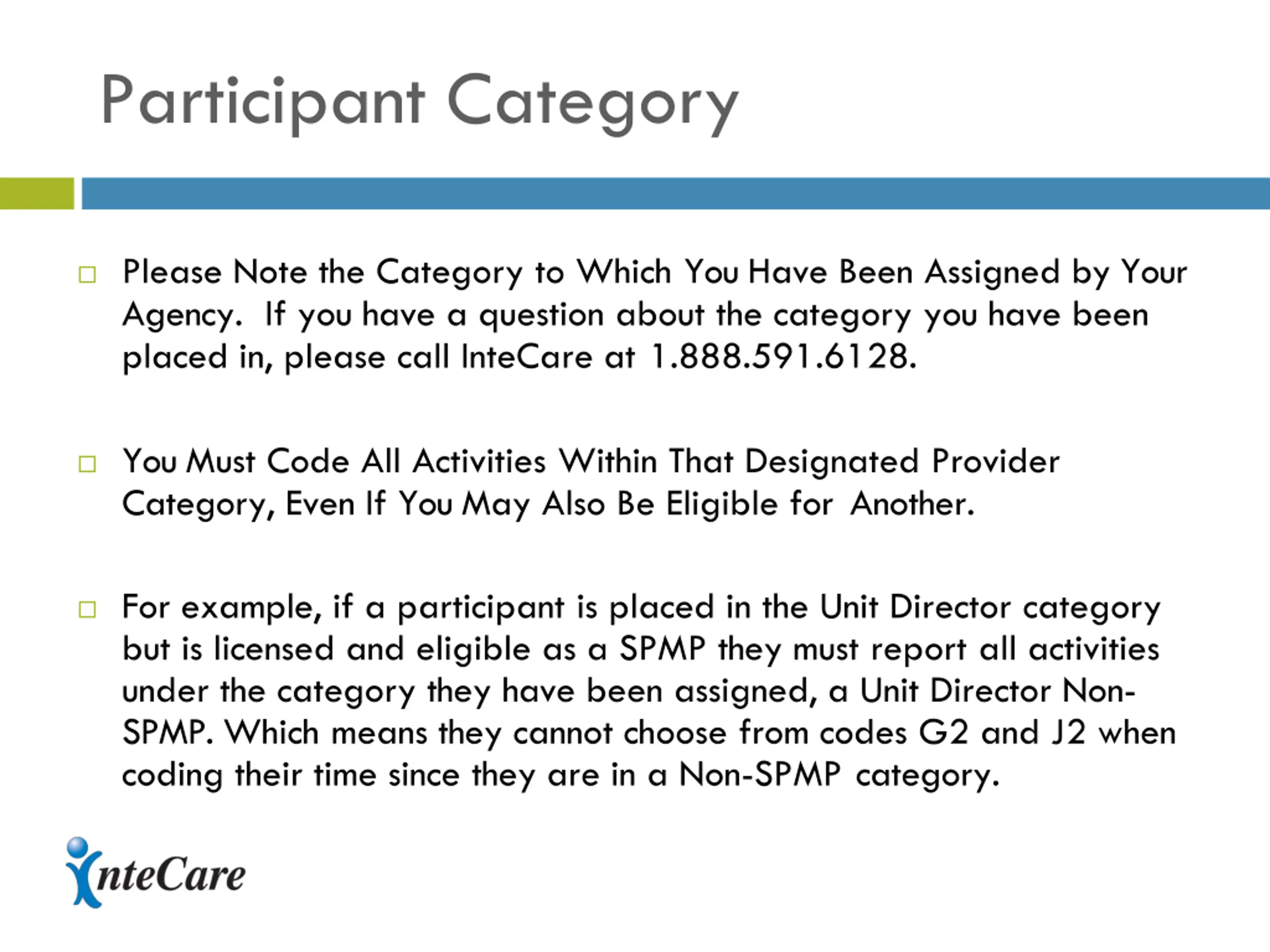 Participant Category Please Note the Category to Which You Have Been Assigned by Your Agency. If you have a question about the category you have been placed in, please call InteCare at 1.888.591.6128. You Must Code All Activities Within That Designated Provider Category, Even If You May Also Be Eligible for Another. For example, if a participant is placed in the Unit Director category but is licensed and eligible as a SPMP they must report all activities under the category they have been assigned, a Unit Director Non- SPMP. Which means they cannot choose from codes G2 and J2 when coding their time since they are in a Non-SPMP category.