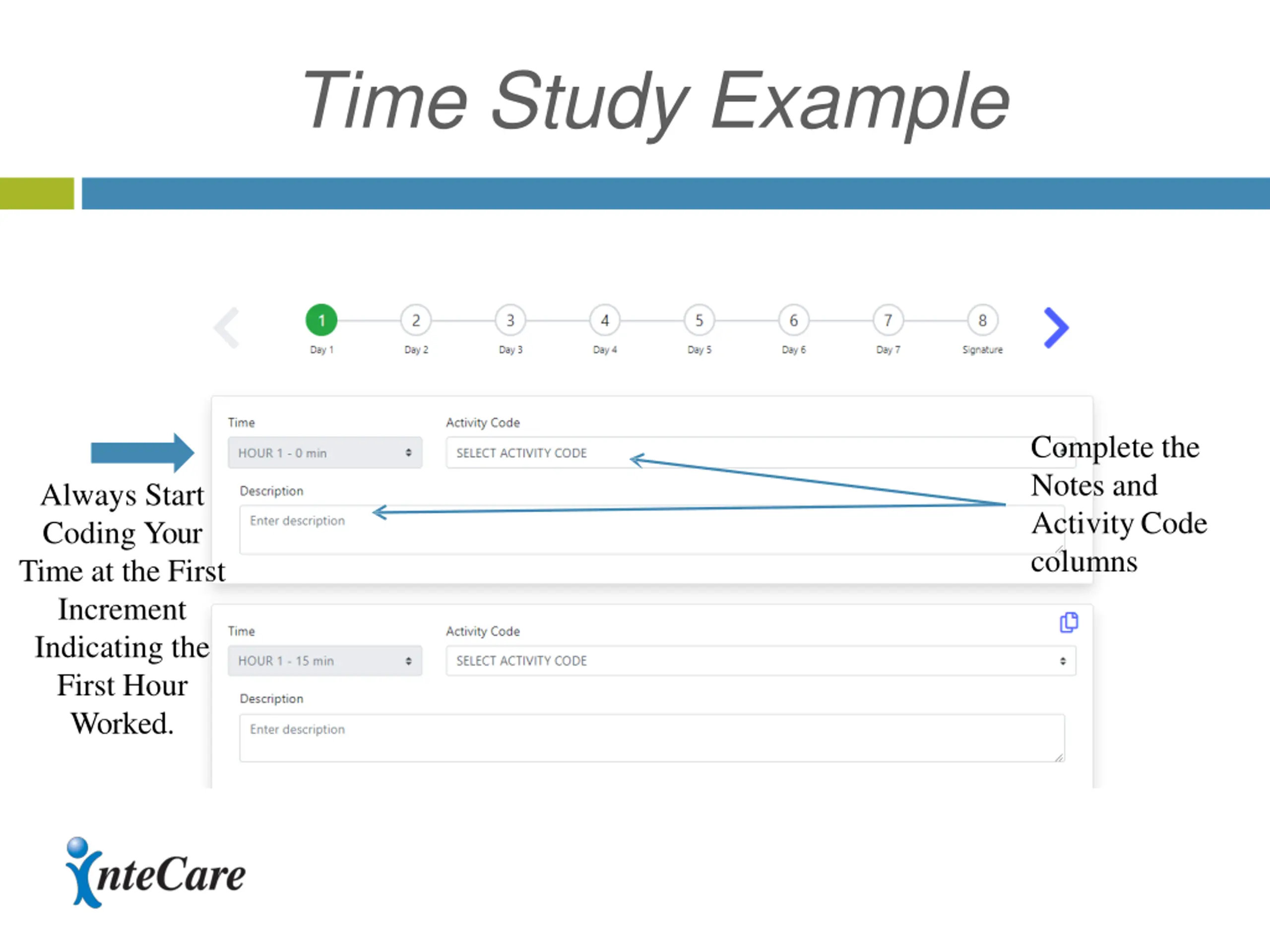 Time Study Example Always Start Coding Your Time at the First Increment Indicating the First Hour Worked. The time represents hours of work; not the actual time of day.