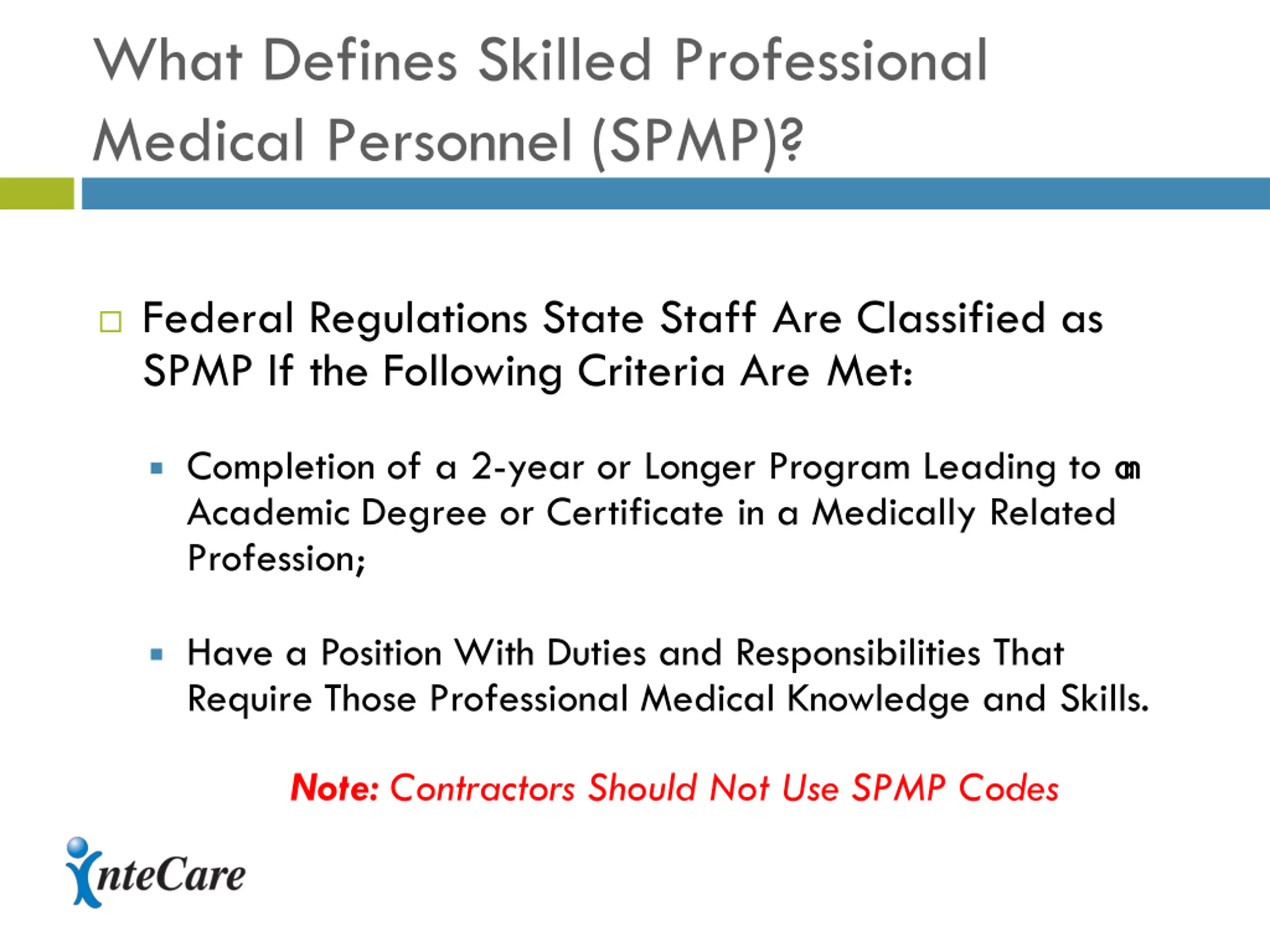 What Defines Skilled Professional Medical Personnel (SPMP)? Federal Regulations State Staff Are Classified as SPMP If the Following Criteria Are Met: Completion of a 2-year or Longer Program Leading to a n Academic Degree or Certificate in a Medically Related Profession; Have a Position With Duties and Responsibilities That Require Those Professional Medical Knowledge and Skills. Note: Contractors Should Not Use SPMP Codes