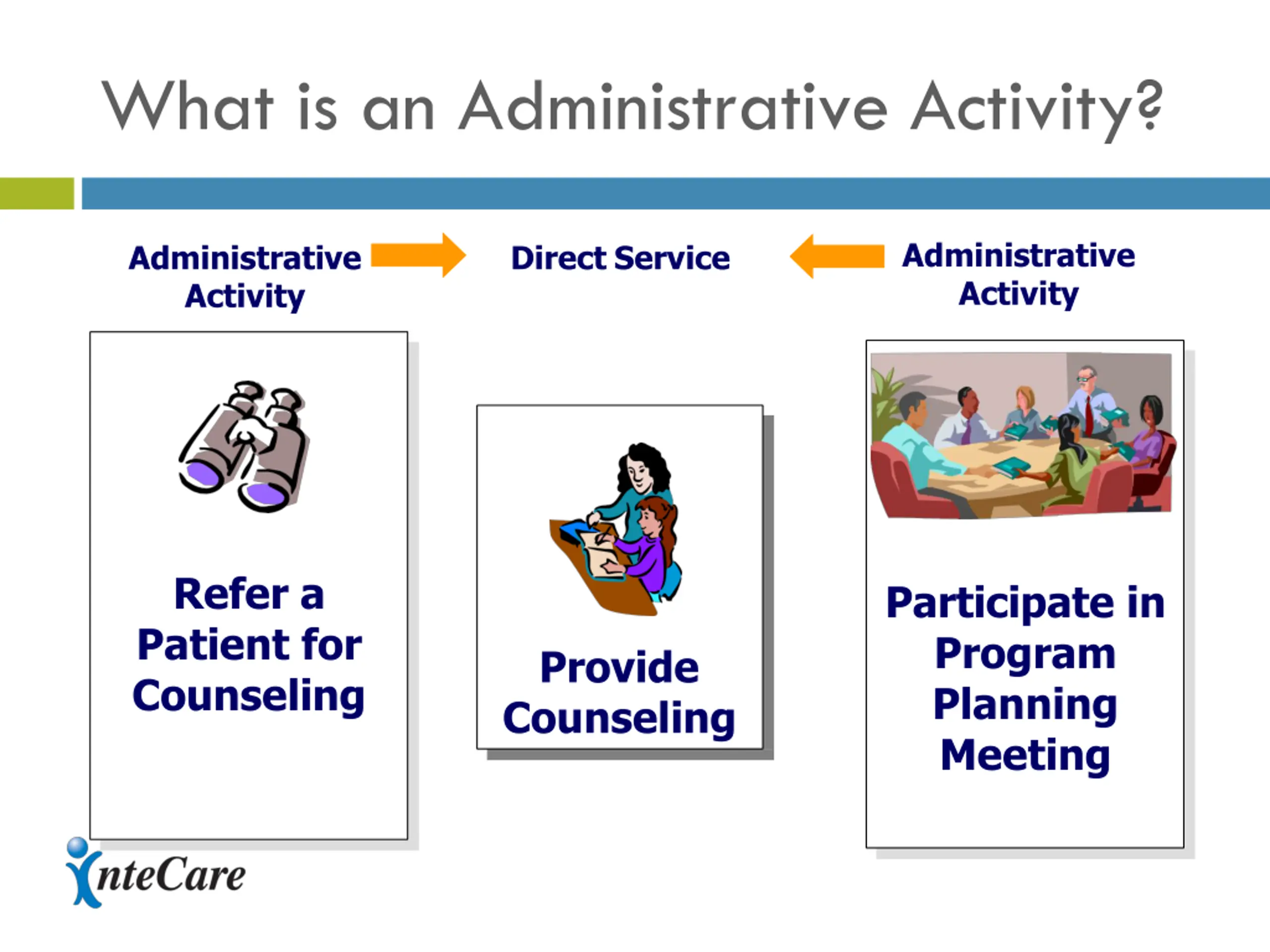 What is an Administrative Activity? Administrative Activity Administrative Activity Direct Service Refer a Patient for Counseling Participate in Program Planning Meeting Provide Counseling