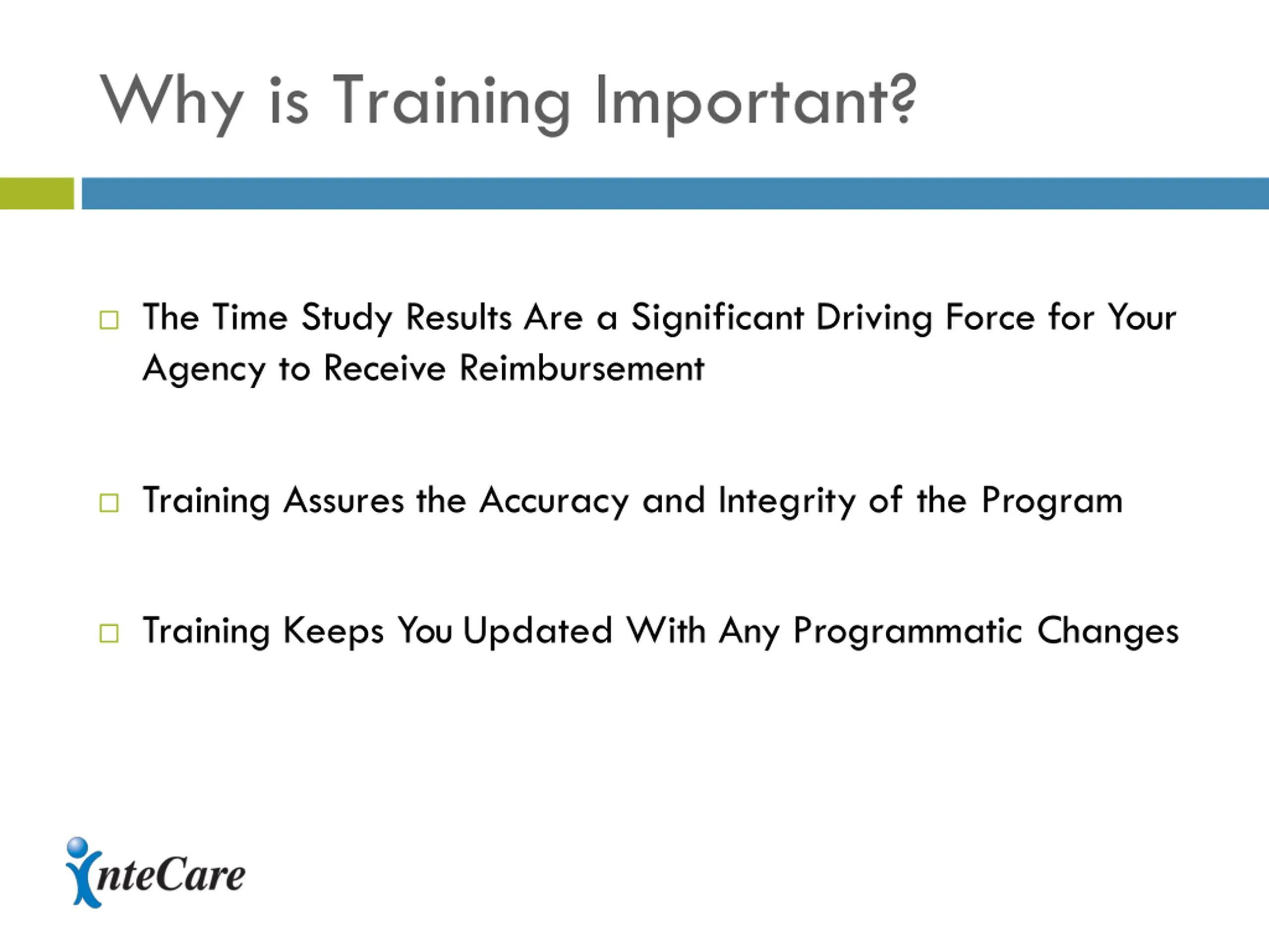 Why is Training Important? The Time Study Results Are a Significant Driving Force for Your Agency to Receive Reimbursement Training Assures the Accuracy and Integrity of the Program Training Keeps You Updated With Any Programmatic Changes