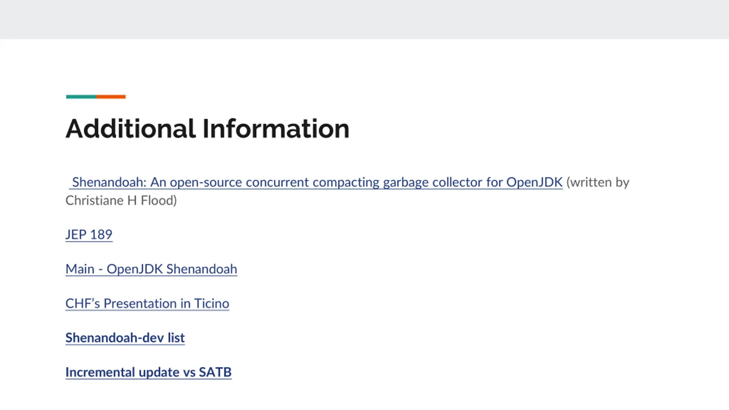Additional Information Shenandoah: An open-source concurrent compacting garbage collector for OpenJDK (written by Christiane H Flood) JEP 189 Main - OpenJDK Shenandoah CHF s Presentation in Ticino Shenandoah-dev list Incremental update vs SATB