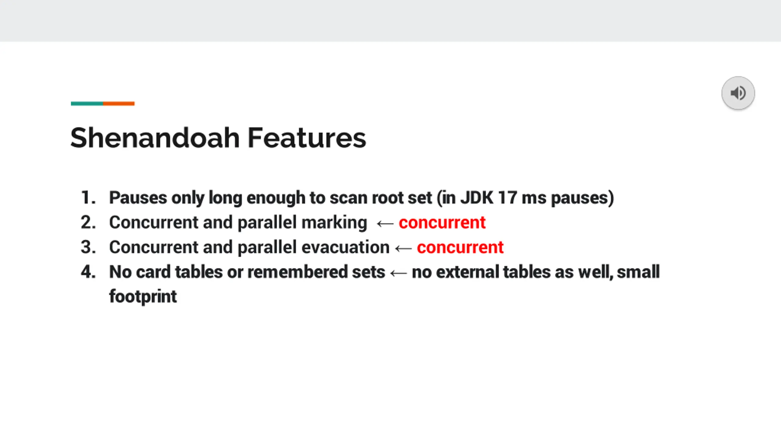shenandoah10.mp3 Shenandoah Features 1. Pauses only long enough to scan root set (in JDK 17 ms pauses) 2. Concurrent and parallel marking concurrent 3. Concurrent and parallel evacuation concurrent 4. No card tables or remembered sets no external tables as well, small footprint