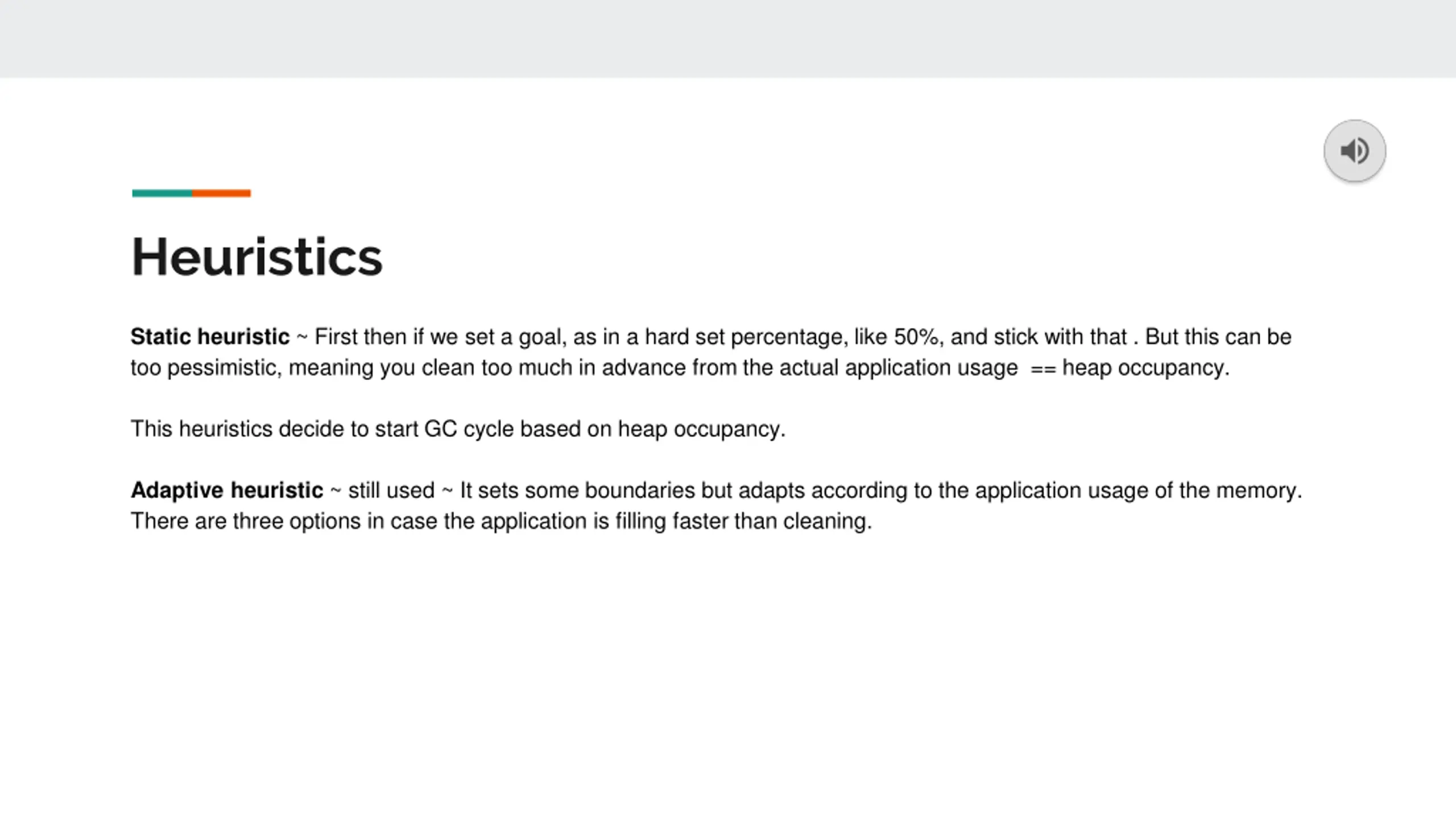 shenandoah11.mp3 Heuristics Static heuristic ~ First then if we set a goal, as in a hard set percentage, like 50%, and stick with that . But this can be too pessimistic, meaning you clean too much in advance from the actual application usage == heap occupancy. This heuristics decide to start GC cycle based on heap occupancy. Adaptive heuristic ~ still used ~ It sets some boundaries but adapts according to the application usage of the memory. There are three options in case the application is filling faster than cleaning.