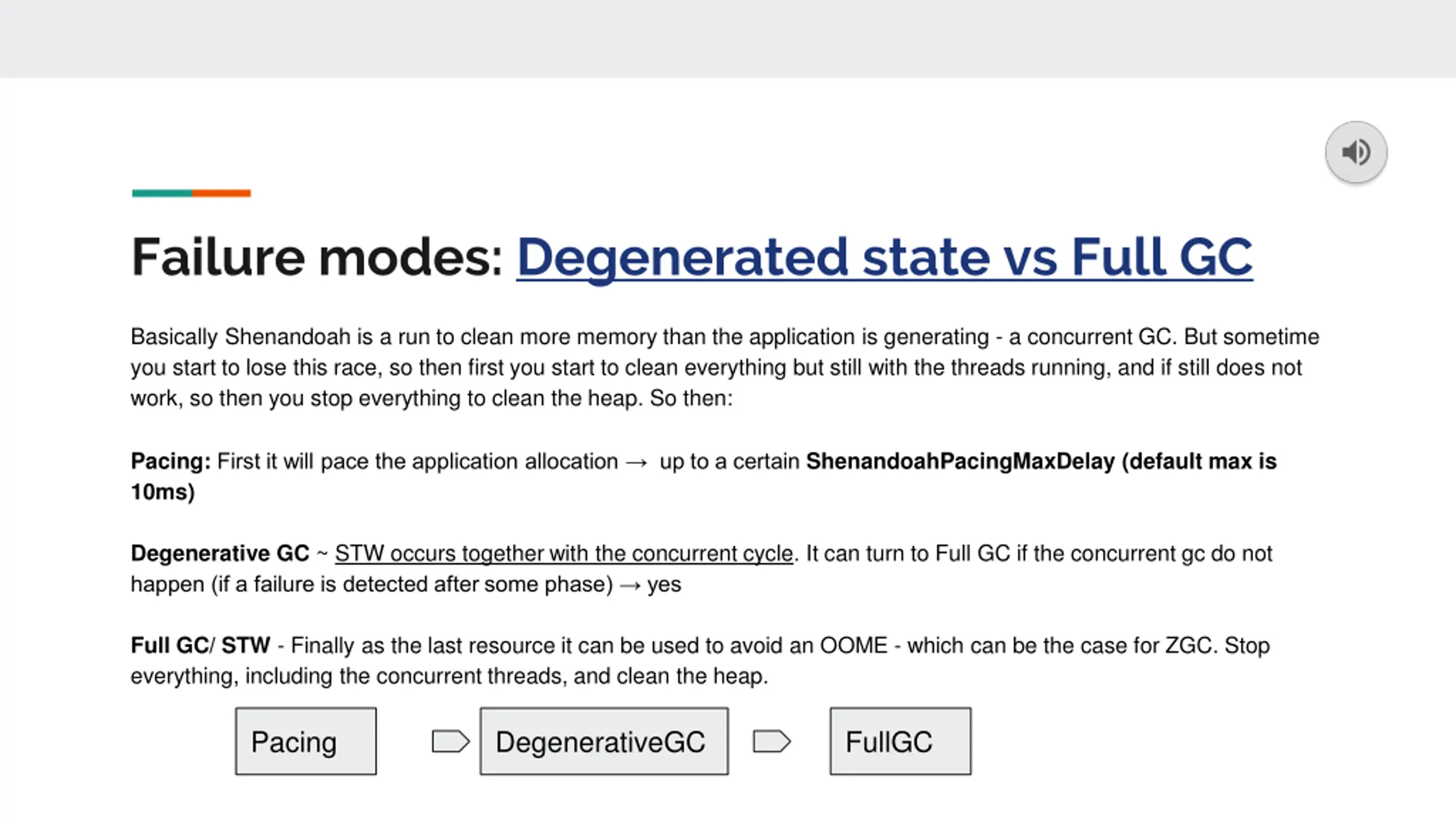 shenandoah12.mp3 Failure modes: Degenerated state vs Full GC Basically Shenandoah is a run to clean more memory than the application is generating - a concurrent GC. But sometime you start to lose this race, so then first you start to clean everything but still with the threads running, and if still does not work, so then you stop everything to clean the heap. So then: Pacing: First it will pace the application allocation up to a certain ShenandoahPacingMaxDelay (default max is 10ms) Degenerative GC ~ STW occurs together with the concurrent cycle. It can turn to Full GC if the concurrent gc do not happen (if a failure is detected after some phase) yes Full GC/ STW - Finally as the last resource it can be used to avoid an OOME - which can be the case for ZGC. Stop everything, including the concurrent threads, and clean the heap. Pacing DegenerativeGC FullGC