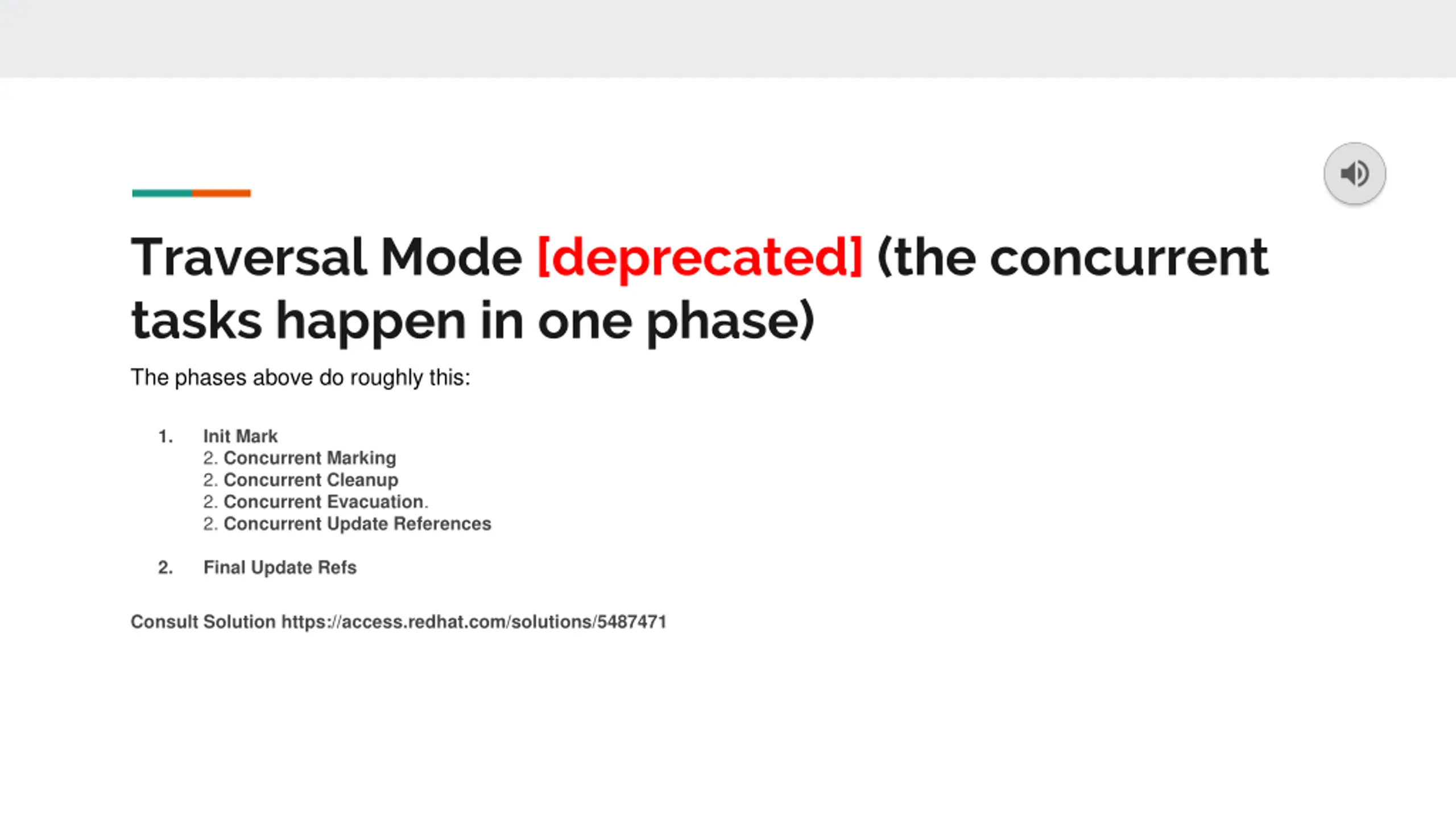 shenandoah13.mp3 Traversal Mode [deprecated] (the concurrent tasks happen in one phase) The phases above do roughly this: 1. Init Mark 2. Concurrent Marking 2. Concurrent Cleanup 2. Concurrent Evacuation. 2. Concurrent Update References 2. Final Update Refs Consult Solution https://access.redhat.com/solutions/5487471