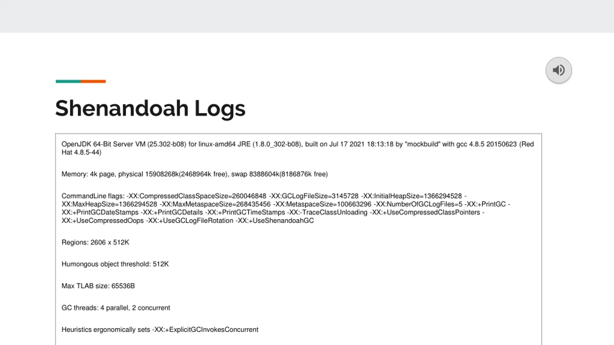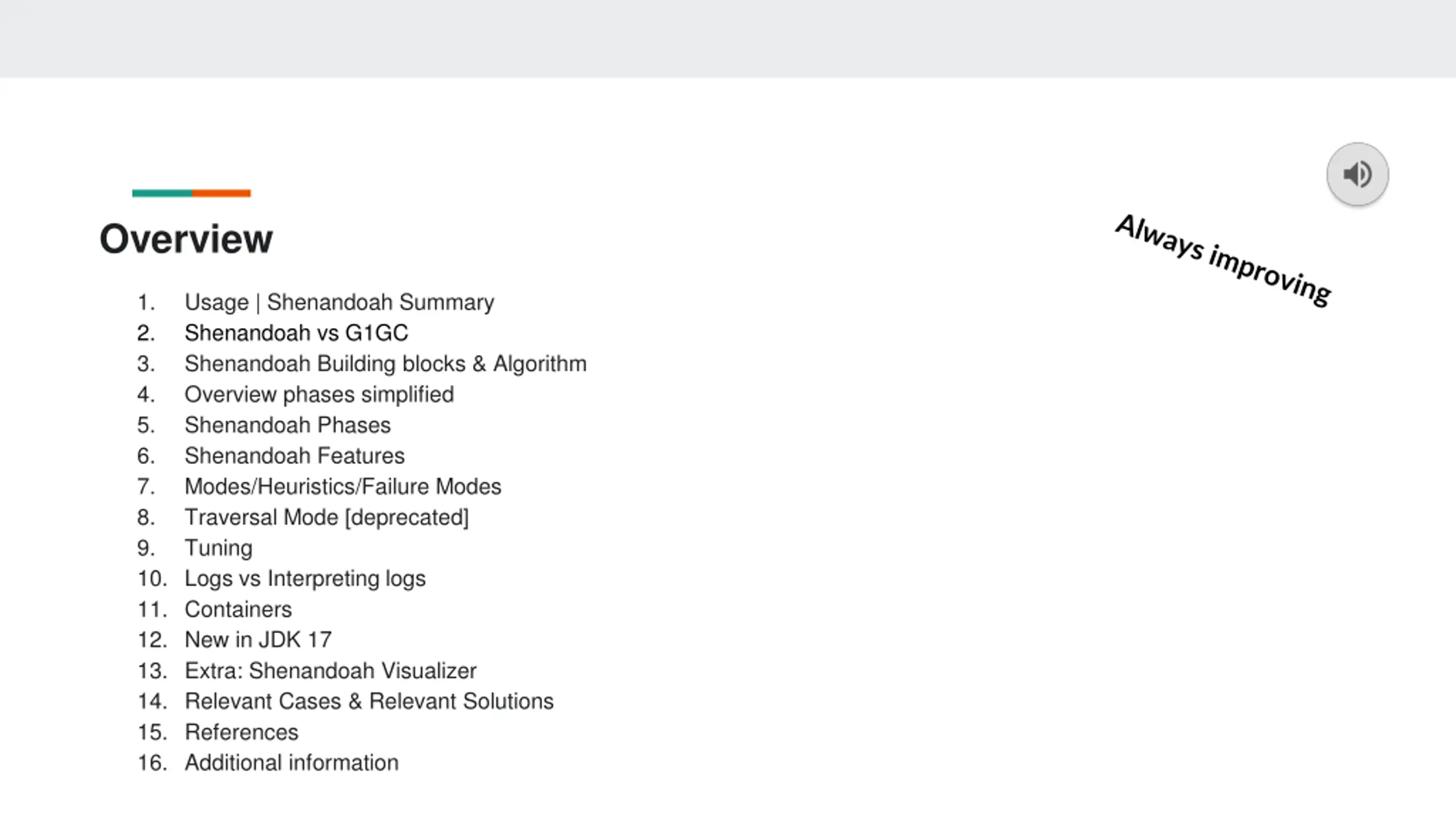 shenandoah2.mp3 Overview 1. 2. 3. 4. 5. 6. 7. 8. 9. 10. Logs vs Interpreting logs 11. Containers 12. New in JDK 17 13. Extra: Shenandoah Visualizer 14. Relevant Cases & Relevant Solutions 15. References 16. Additional information Usage | Shenandoah Summary Shenandoah vs G1GC Shenandoah Building blocks & Algorithm Overview phases simplified Shenandoah Phases Shenandoah Features Modes/Heuristics/Failure Modes Traversal Mode [deprecated] Tuning