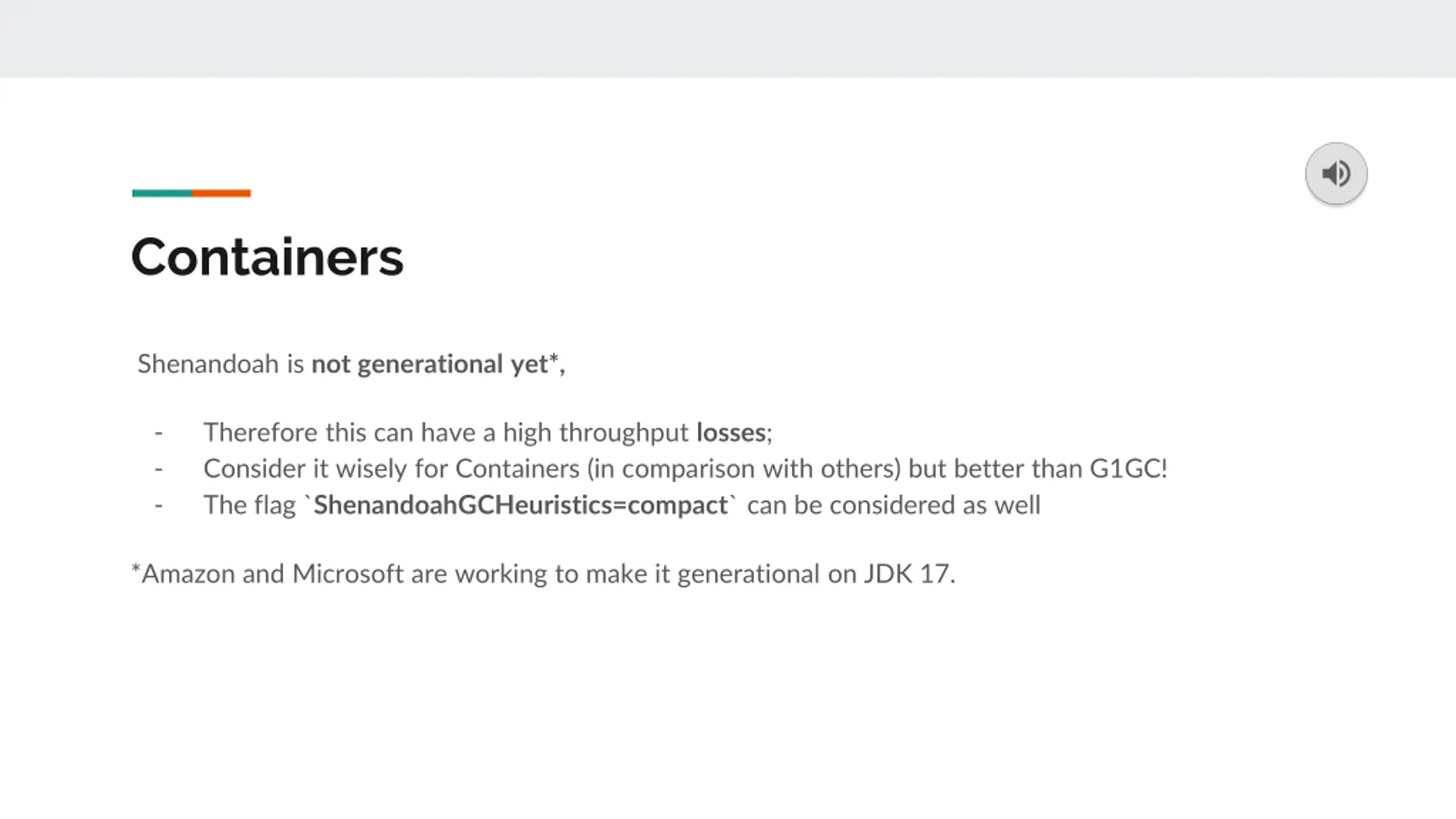 shenandoah17.mp3 Containers Shenandoah is not generational yet*, - - - Therefore this can have a high throughput losses; Consider it wisely for Containers (in comparison with others) but better than G1GC! The flag `ShenandoahGCHeuristics=compact` can be considered as well *Amazon and Microsoft are working to make it generational on JDK 17.
