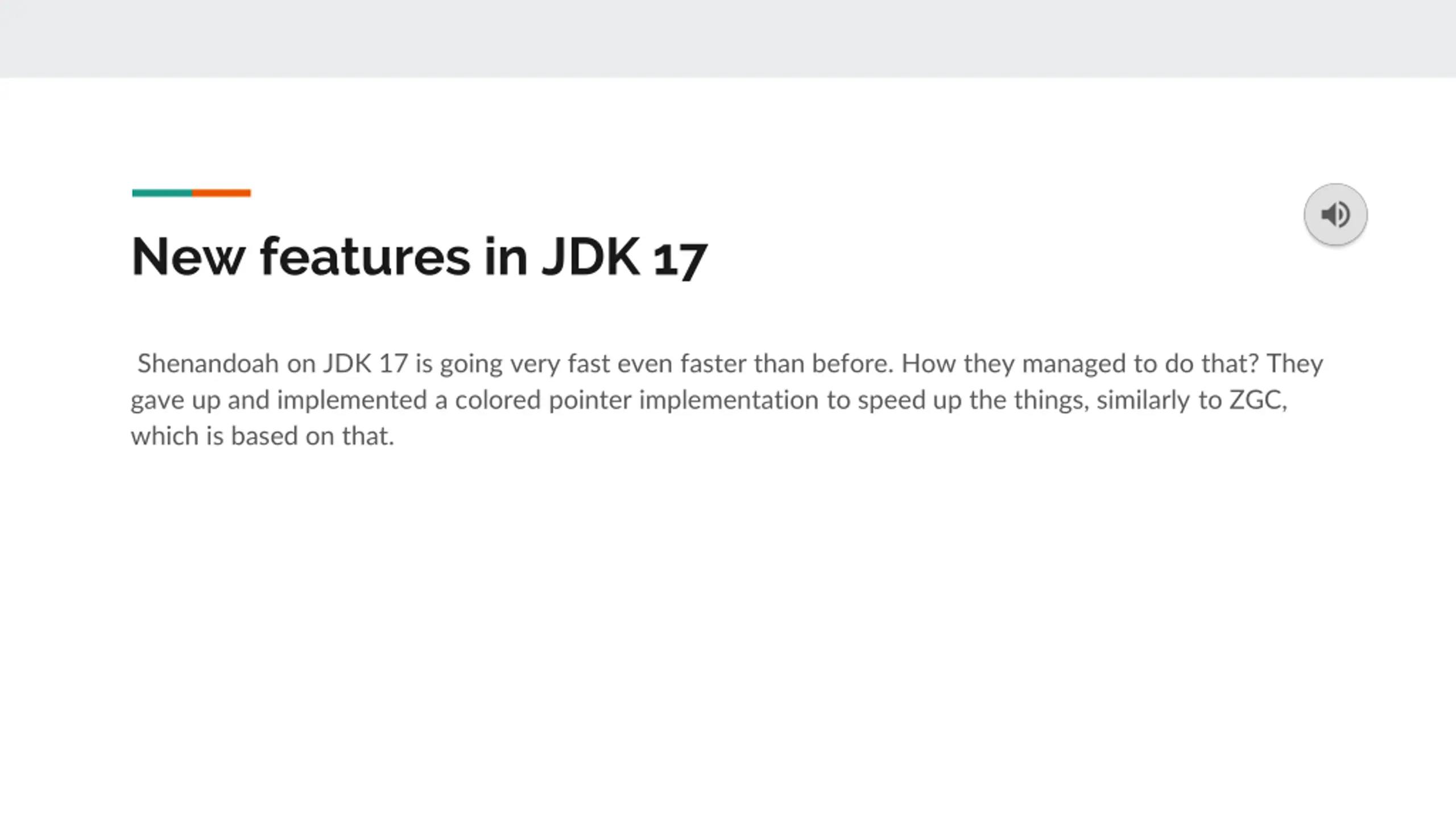 shenandoah18.mp3 New features in JDK 17 Shenandoah on JDK 17 is going very fast even faster than before. How they managed to do that? They gave up and implemented a colored pointer implementation to speed up the things, similarly to ZGC, which is based on that.