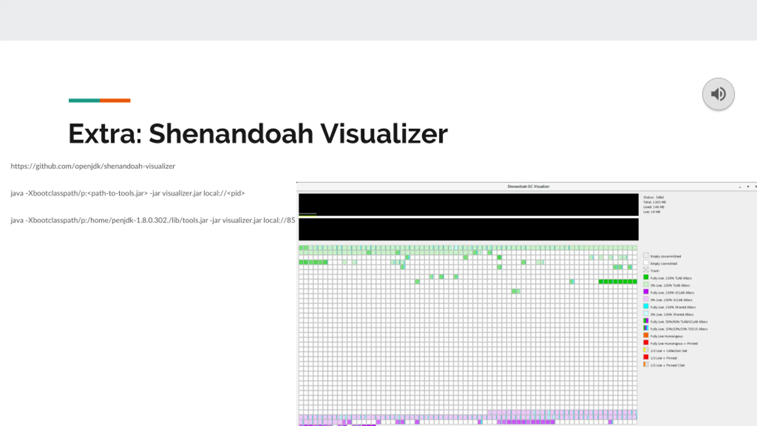 shenandoah19.mp3 Extra: Shenandoah Visualizer https://github.com/openjdk/shenandoah-visualizer java -Xbootclasspath/p:<path-to-tools.jar> -jar visualizer.jar local://<pid> java -Xbootclasspath/p:/home/penjdk-1.8.0.302./lib/tools.jar -jar visualizer.jar local://85