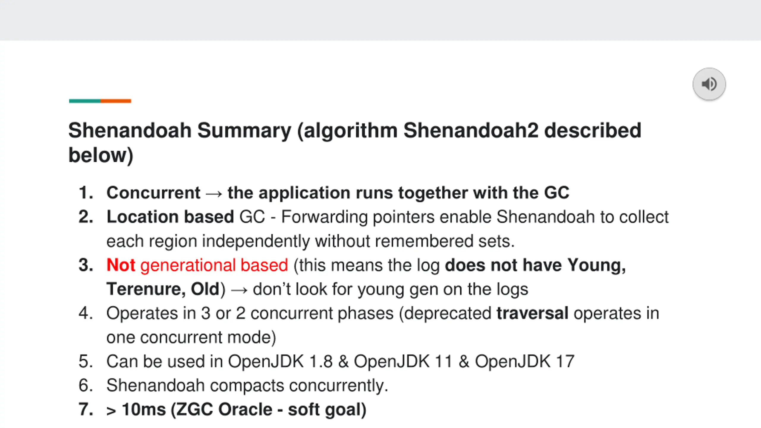 shenandoah3.mp3 Shenandoah Summary (algorithm Shenandoah2 described below) 1. Concurrent the application runs together with the GC 2. Location based GC - Forwarding pointers enable Shenandoah to collect each region independently without remembered sets. 3. Not generational based (this means the log does not have Young, Terenure, Old) don t look for young gen on the logs 4. Operates in 3 or 2 concurrent phases (deprecated traversal operates in one concurrent mode) 5. Can be used in OpenJDK 1.8 & OpenJDK 11 & OpenJDK 17 6. Shenandoah compacts concurrently. 7. > 10ms (ZGC Oracle - soft goal)