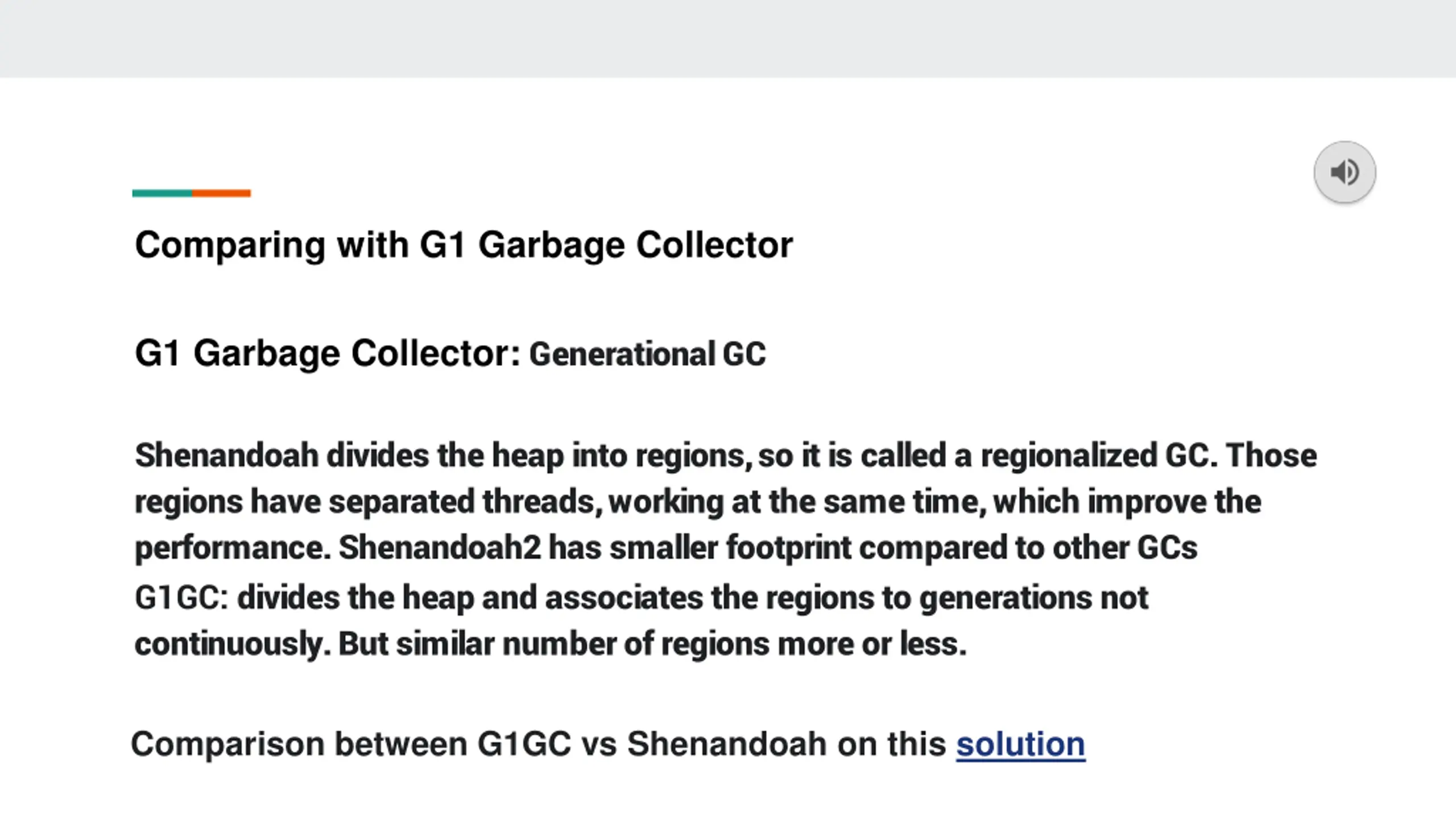 shenandoah4.mp3 Comparing with G1 Garbage Collector G1 Garbage Collector: Generational GC Shenandoah divides the heap into regions, so it is called a regionalized GC. Those regions have separated threads, working at the same time, which improve the performance. Shenandoah2 has smaller footprint compared to other GCs G1GC: divides the heap and associates the regions to generations not continuously. But similar number of regions more or less. Comparison between G1GC vs Shenandoah on this solution