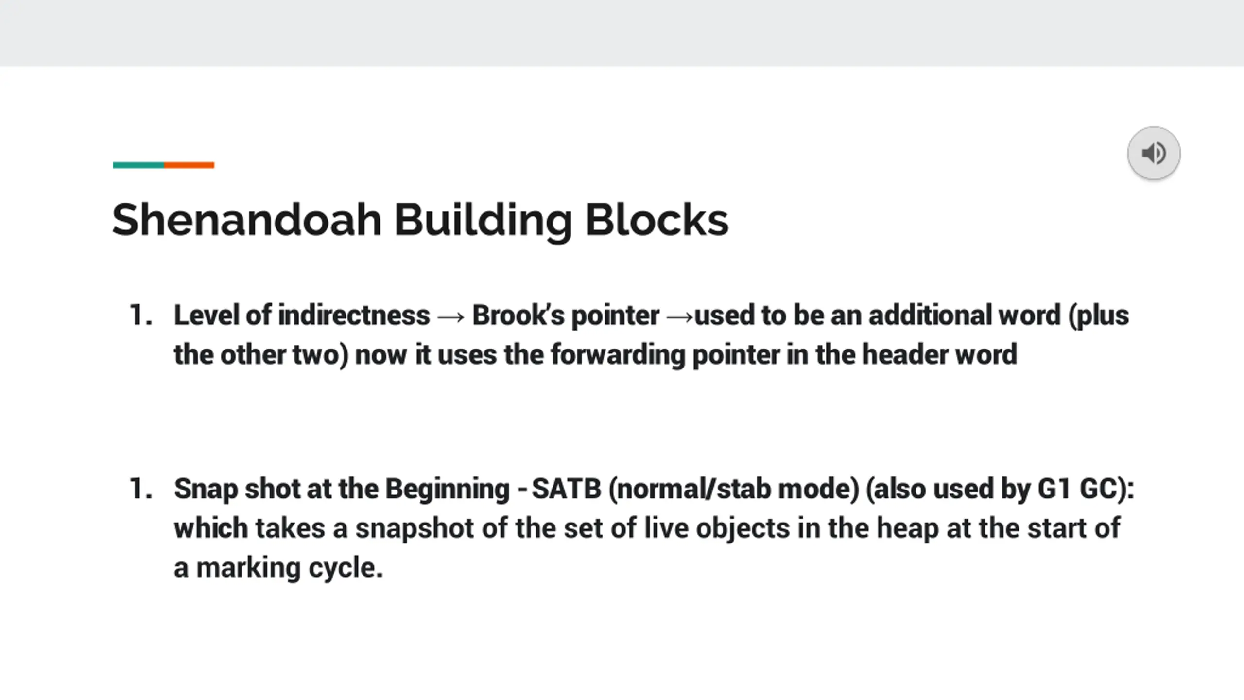 shenandoah5.mp3 Shenandoah Building Blocks 1. Level of indirectness Brook s pointer used to be an additional word (plus the other two) now it uses the forwarding pointer in the header word 1. Snap shot at the Beginning -SATB (normal/stab mode) (also used by G1 GC): which takes a snapshot of the set of live objects in the heap at the start of a marking cycle.