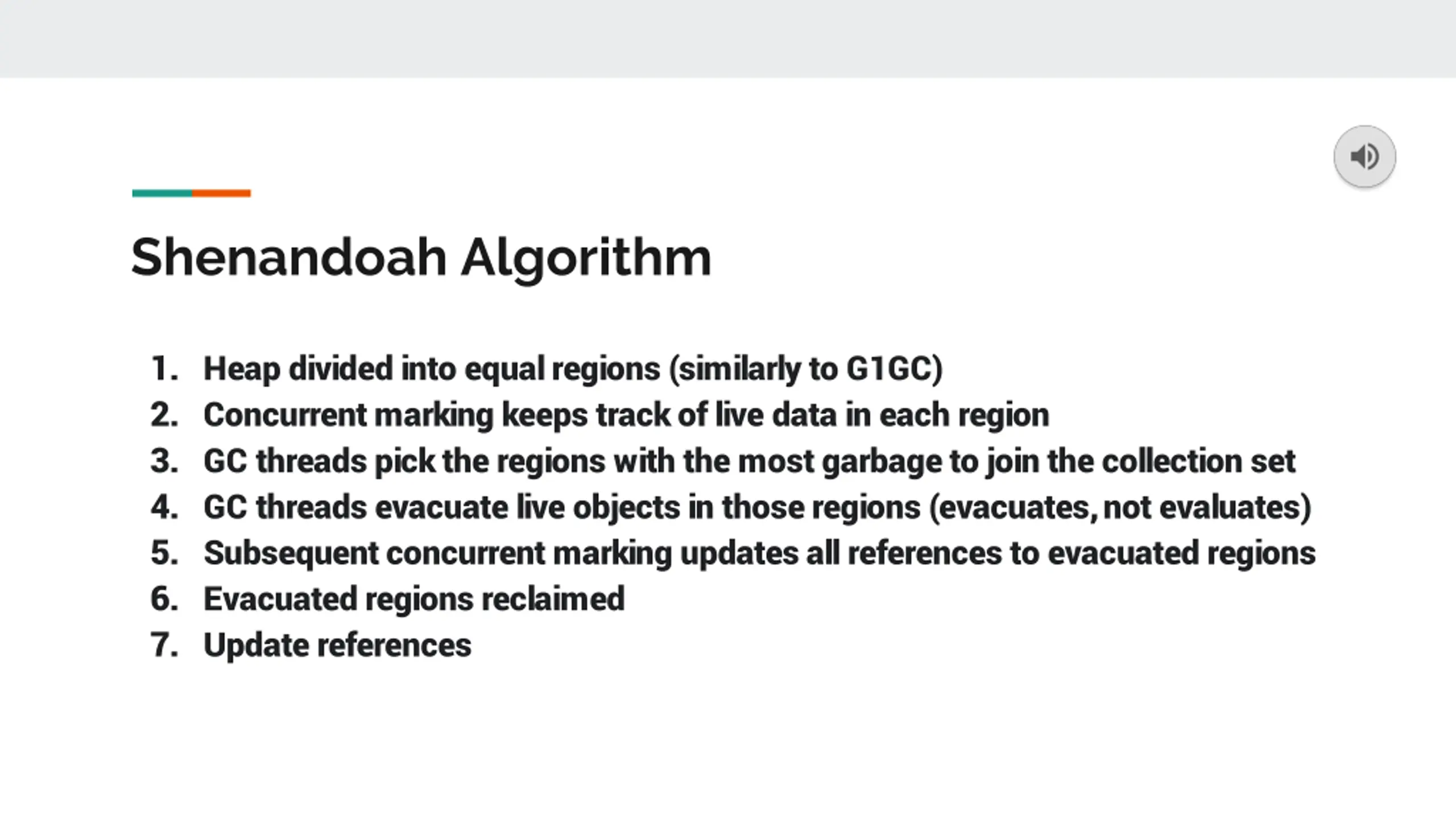 shenandoah6.mp3 Shenandoah Algorithm 1. Heap divided into equal regions (similarly to G1GC) 2. Concurrent marking keeps track of live data in each region 3. GC threads pick the regions with the most garbage to join the collection set 4. GC threads evacuate live objects in those regions (evacuates, not evaluates) 5. Subsequent concurrent marking updates all references to evacuated regions 6. Evacuated regions reclaimed 7. Update references