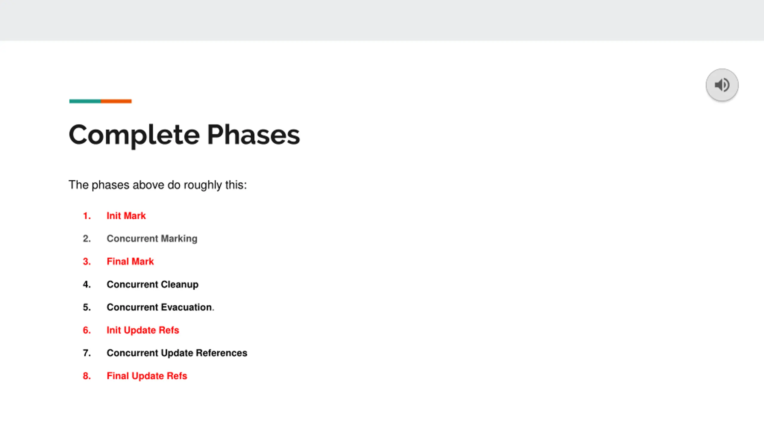 shenandoah9.mp3 Complete Phases The phases above do roughly this: 1. Init Mark 2. Concurrent Marking 3. Final Mark 4. Concurrent Cleanup Concurrent Evacuation. 5. 6. Init Update Refs 7. Concurrent Update References 8. Final Update Refs