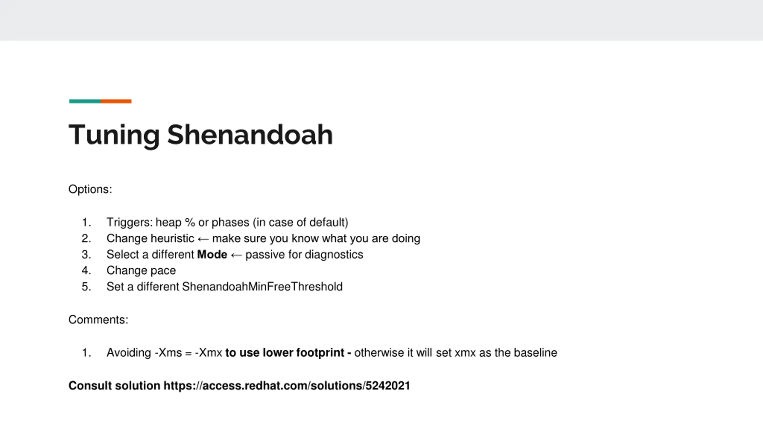Tuning Shenandoah Options: 1. 2. 3. 4. 5. Triggers: heap % or phases (in case of default) Change heuristic make sure you know what you are doing Select a different Mode passive for diagnostics Change pace Set a different ShenandoahMinFreeThreshold Comments: 1. Avoiding -Xms = -Xmx to use lower footprint - otherwise it will set xmx as the baseline Consult solution https://access.redhat.com/solutions/5242021