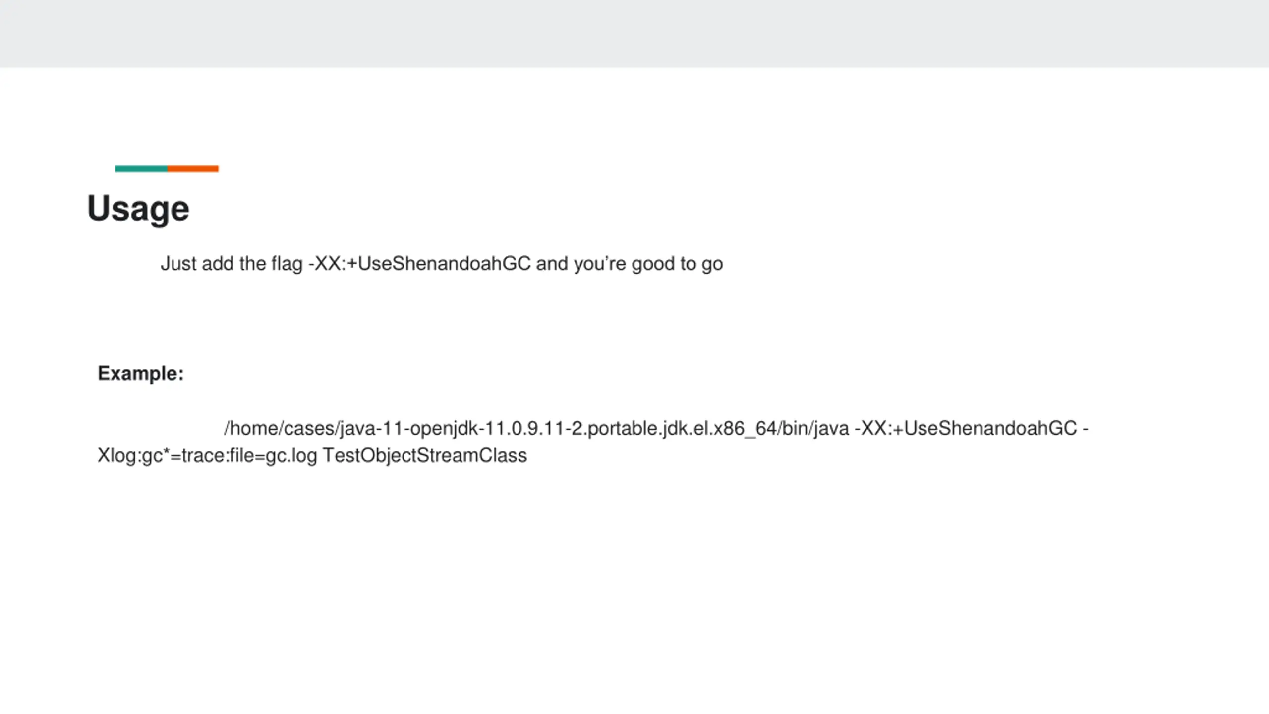 Usage Just add the flag -XX:+UseShenandoahGC and you re good to go Example: /home/cases/java-11-openjdk-11.0.9.11-2.portable.jdk.el.x86_64/bin/java -XX:+UseShenandoahGC - Xlog:gc*=trace:file=gc.log TestObjectStreamClass