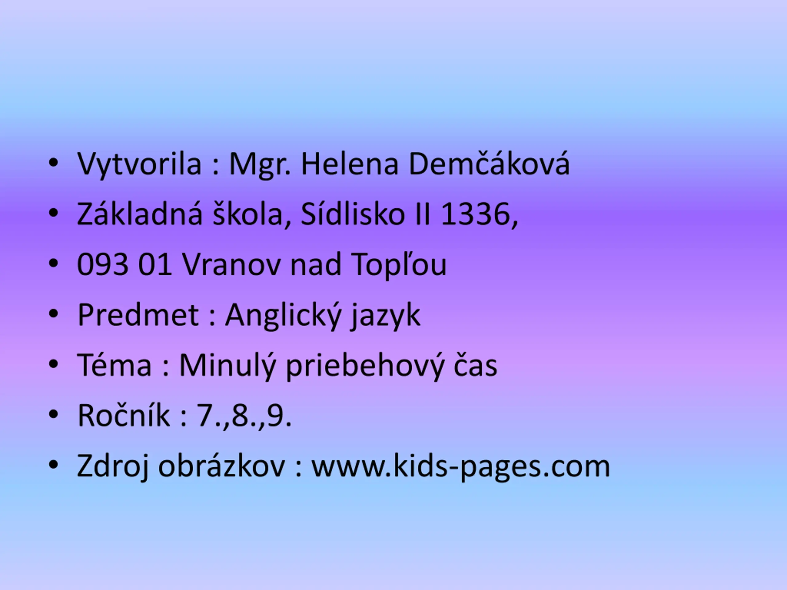 Vytvorila : Mgr. Helena Demkov Z kladn kola, S dlisko II 1336, 093 01 Vranov nad Top ou Predmet : Anglick jazyk T ma : Minul priebehov as Ro n k : 7.,8.,9. Zdroj obr zkov : www.kids-pages.com