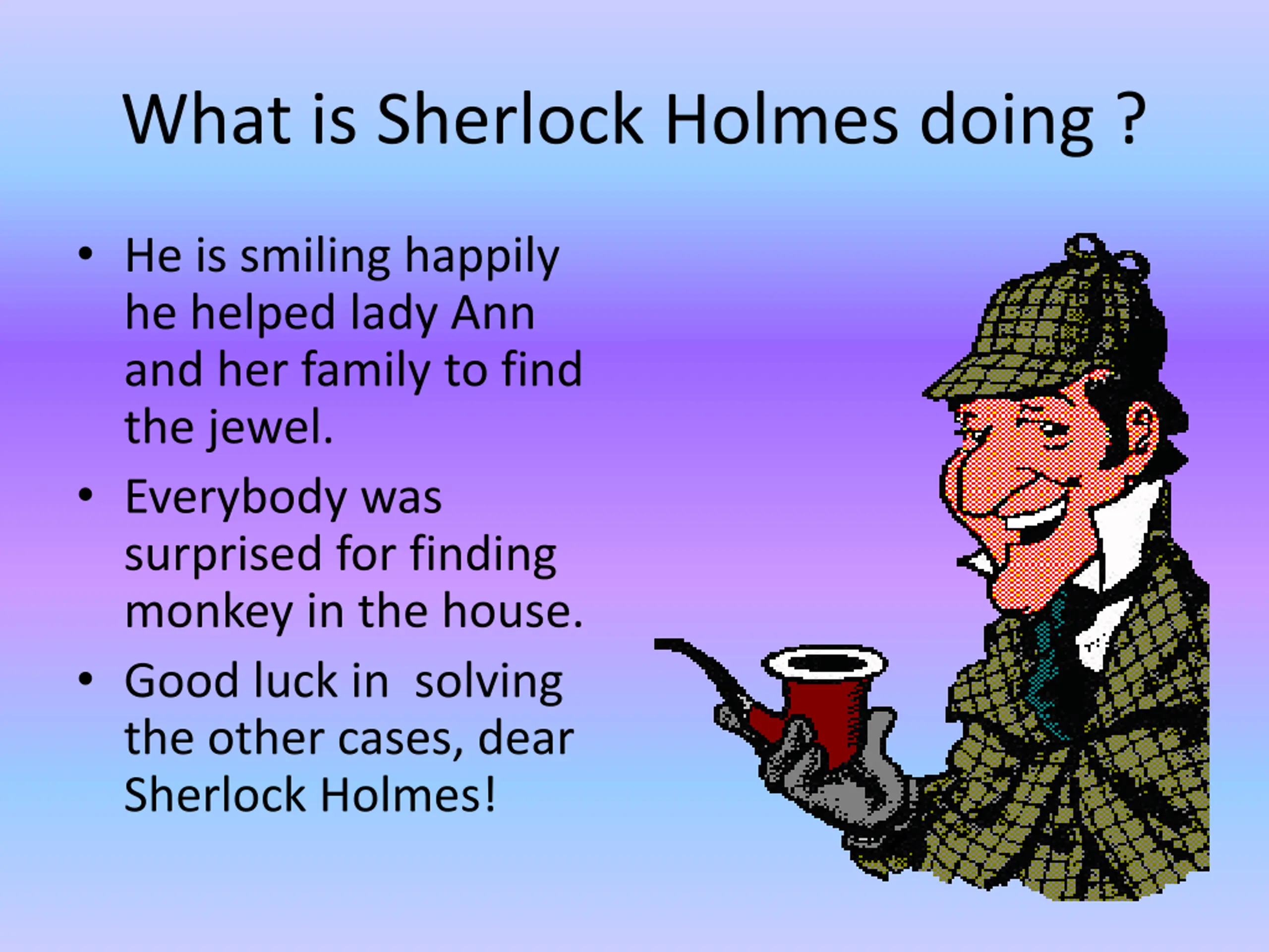 What is Sherlock Holmes doing ? He is smiling happily he helped lady Ann and her family to find the jewel. Everybody was surprised for finding monkey in the house. Good luck in solving the other cases, dear Sherlock Holmes!