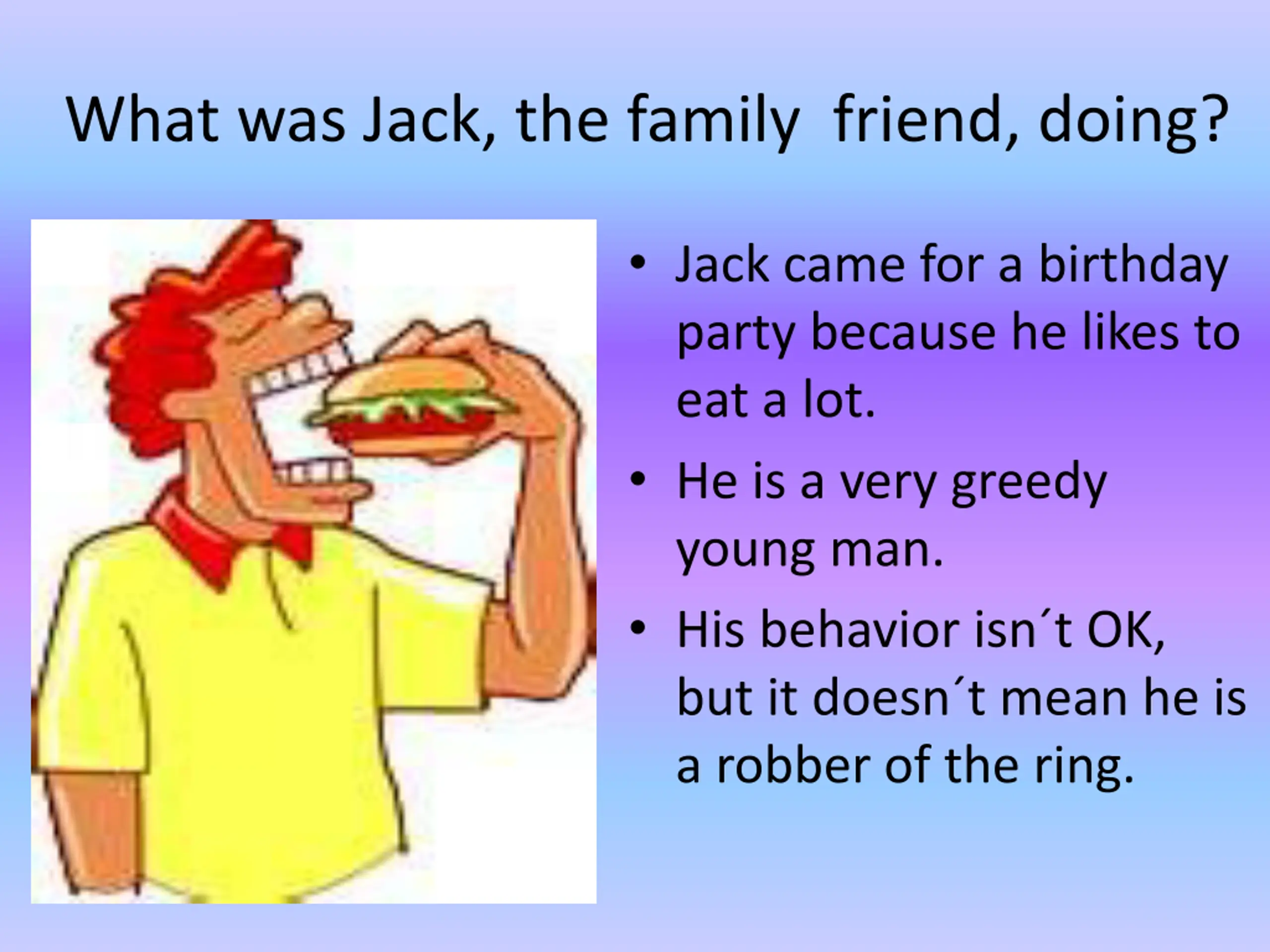 What was Jack, the family friend, doing? Jack came for a birthday party because he likes to eat a lot. He is a very greedy young man. His behavior isn t OK, but it doesn t mean he is a robber of the ring.