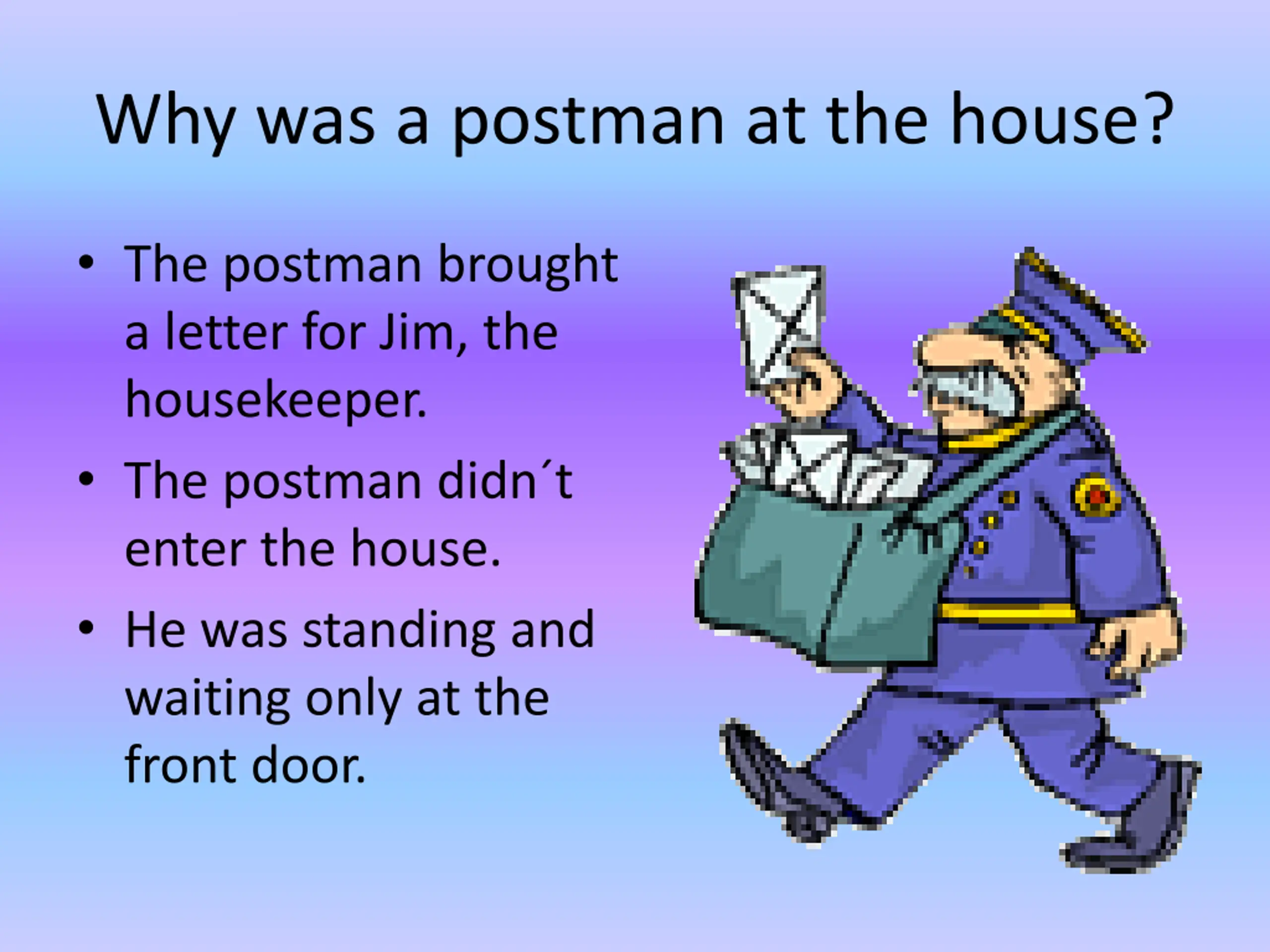 Why was a postman at the house? The postman brought a letter for Jim, the housekeeper. The postman didn t enter the house. He was standing and waiting only at the front door.