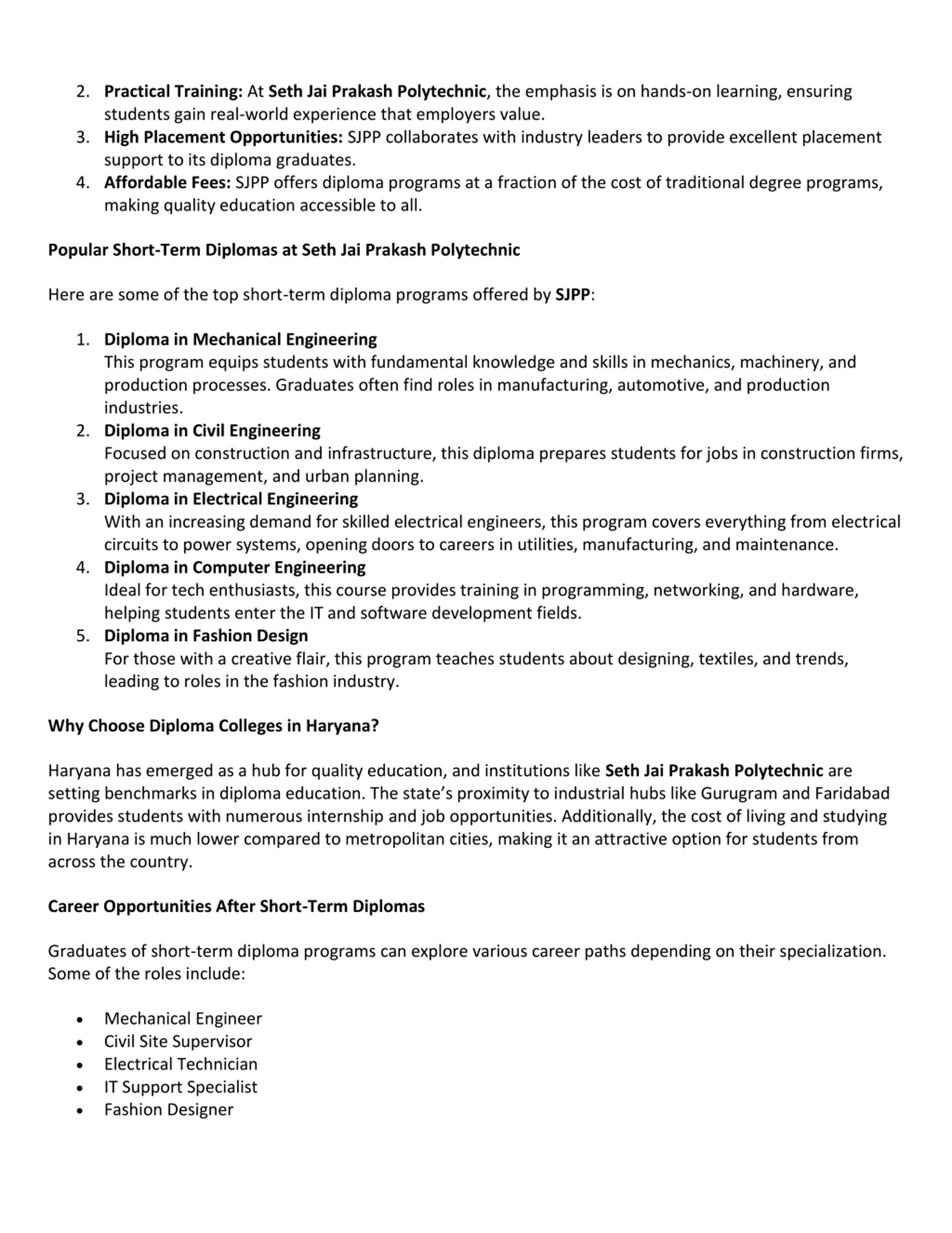 2.Practical Training: At Seth Jai Prakash Polytechnic, the emphasis is on hands-on learning, ensuring students gain real-world experience that employers value. 3.High Placement Opportunities: SJPP collaborates with industry leaders to provide excellent placement support to its diploma graduates. 4.Affordable Fees: SJPP offers diploma programs at a fraction of the cost of traditional degree programs, making quality education accessible to all. Popular Short-Term Diplomas at Seth Jai Prakash Polytechnic Here are some of the top short-term diploma programs offered by SJPP: 1.Diploma in Mechanical Engineering This program equips students with fundamental knowledge and skills in mechanics, machinery, and production processes. Graduates often find roles in manufacturing, automotive, and production industries. 2.Diploma in Civil Engineering Focused on construction and infrastructure, this diploma prepares students for jobs in construction firms, project management, and urban planning. 3.Diploma in Electrical Engineering With an increasing demand for skilled electrical engineers, this program covers everything from electrical circuits to power systems, opening doors to careers in utilities, manufacturing, and maintenance. 4.Diploma in Computer Engineering Ideal for tech enthusiasts, this course provides training in programming, networking, and hardware, helping students enter the IT and software development fields. 5.Diploma in Fashion Design For those with a creative flair, this program teaches students about designing, textiles, and trends, leading to roles in the fashion industry. Why Choose Diploma Colleges in Haryana? Haryana has emerged as a hub for quality education, and institutions like Seth Jai Prakash Polytechnic are setting benchmarks in diploma education. The state s proximity to industrial hubs like Gurugram and Faridabad provides students with numerous internship and job opportunities. Additionally, the cost of living and studying in Haryana is much lower compared to metropolitan cities, making it an attractive option for students from across the country. Career Opportunities After Short-Term Diplomas Graduates of short-term diploma programs can explore various career paths depending on their specialization. Some of the roles include: Mechanical Engineer Civil Site Supervisor Electrical Technician IT Support Specialist Fashion Designer