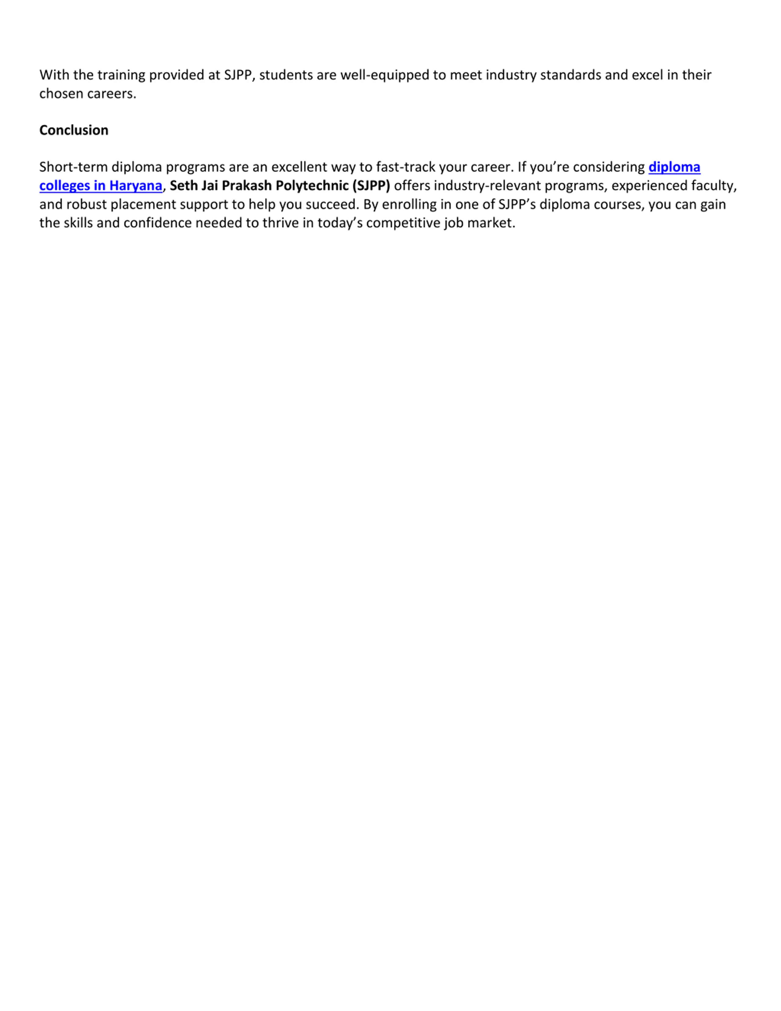 With the training provided at SJPP, students are well-equipped to meet industry standards and excel in their chosen careers. Conclusion Short-term diploma programs are an excellent way to fast-track your career. If you re considering diploma colleges in Haryana, Seth Jai Prakash Polytechnic (SJPP) offers industry-relevant programs, experienced faculty, and robust placement support to help you succeed. By enrolling in one of SJPP s diploma courses, you can gain the skills and confidence needed to thrive in today s competitive job market.