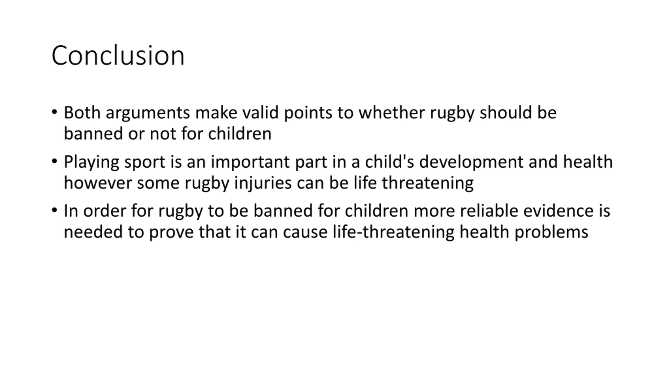 Conclusion Both arguments make valid points to whether rugby should be banned or not for children Playing sport is an important part in a child's development and health however some rugby injuries can be life threatening In order for rugby to be banned for children more reliable evidence is needed to prove that it can cause life-threatening health problems