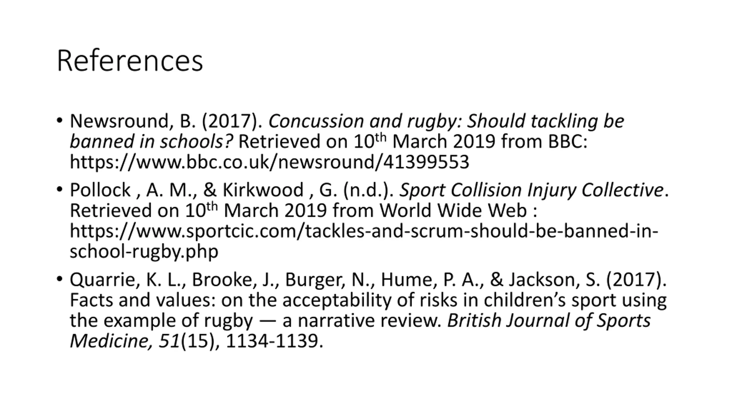 References Newsround, B. (2017). Concussion and rugby: Should tackling be banned in schools? Retrieved on 10thMarch 2019 from BBC: https://www.bbc.co.uk/newsround/41399553 Pollock , A. M., & Kirkwood , G. (n.d.). Sport Collision Injury Collective. Retrieved on 10thMarch 2019 from World Wide Web : https://www.sportcic.com/tackles-and-scrum-should-be-banned-in- school-rugby.php Quarrie, K. L., Brooke, J., Burger, N., Hume, P. A., & Jackson, S. (2017). Facts and values: on the acceptability of risks in children s sport using the example of rugby a narrative review. British Journal of Sports Medicine, 51(15), 1134-1139.